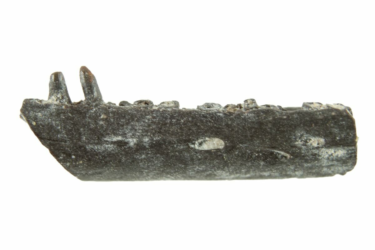 This is a .27" wide jaw section with two teeth of a Lower Permian reptile collected from the Richard's Spur Quarry near Lawton, Oklahoma. This permian reptile material is found within cave fissure fill deposits in the quarry.
