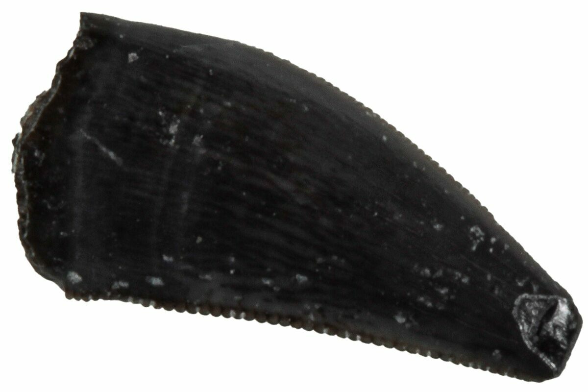 This is a .27" long, serrated, Triassic reptile (Postosuchus?) tooth from the Chinle Formation of Arizona. It has beautiful black-grey preservation and fine serrations.