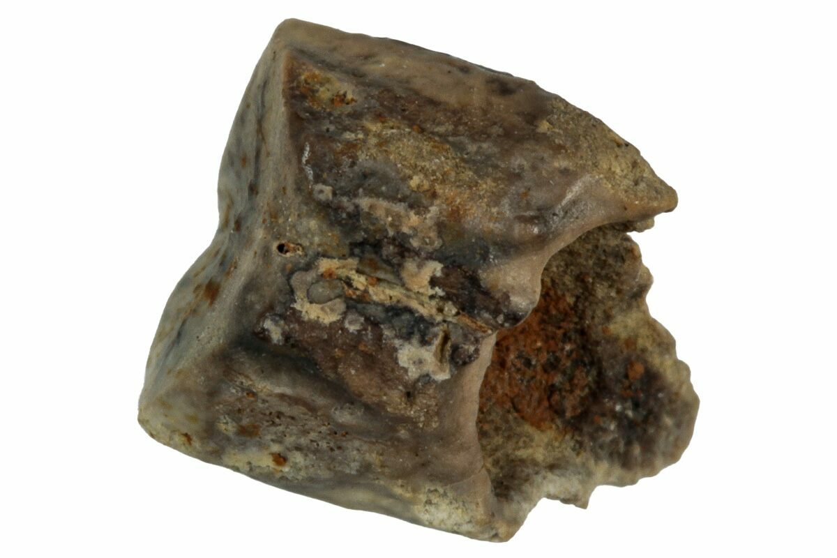 This is a tooth from a hadrosaur (Edmontosaurus annectens), collected from the Hell Creek Formation of Montana. Hadrosaurs had a massive battery of small teeth (up to 900 in some species) in their mouth for grinding tough vegetation and they shed their teeth as they become worn. These shed teeth, often called "spitters", are small and block-like in appearance.