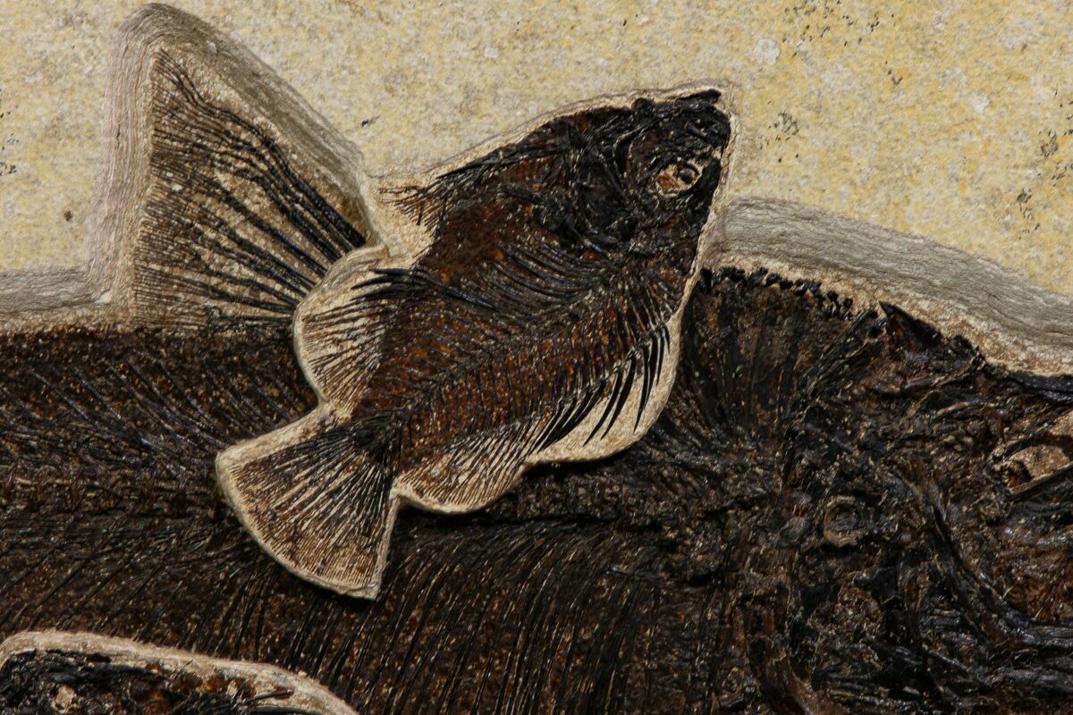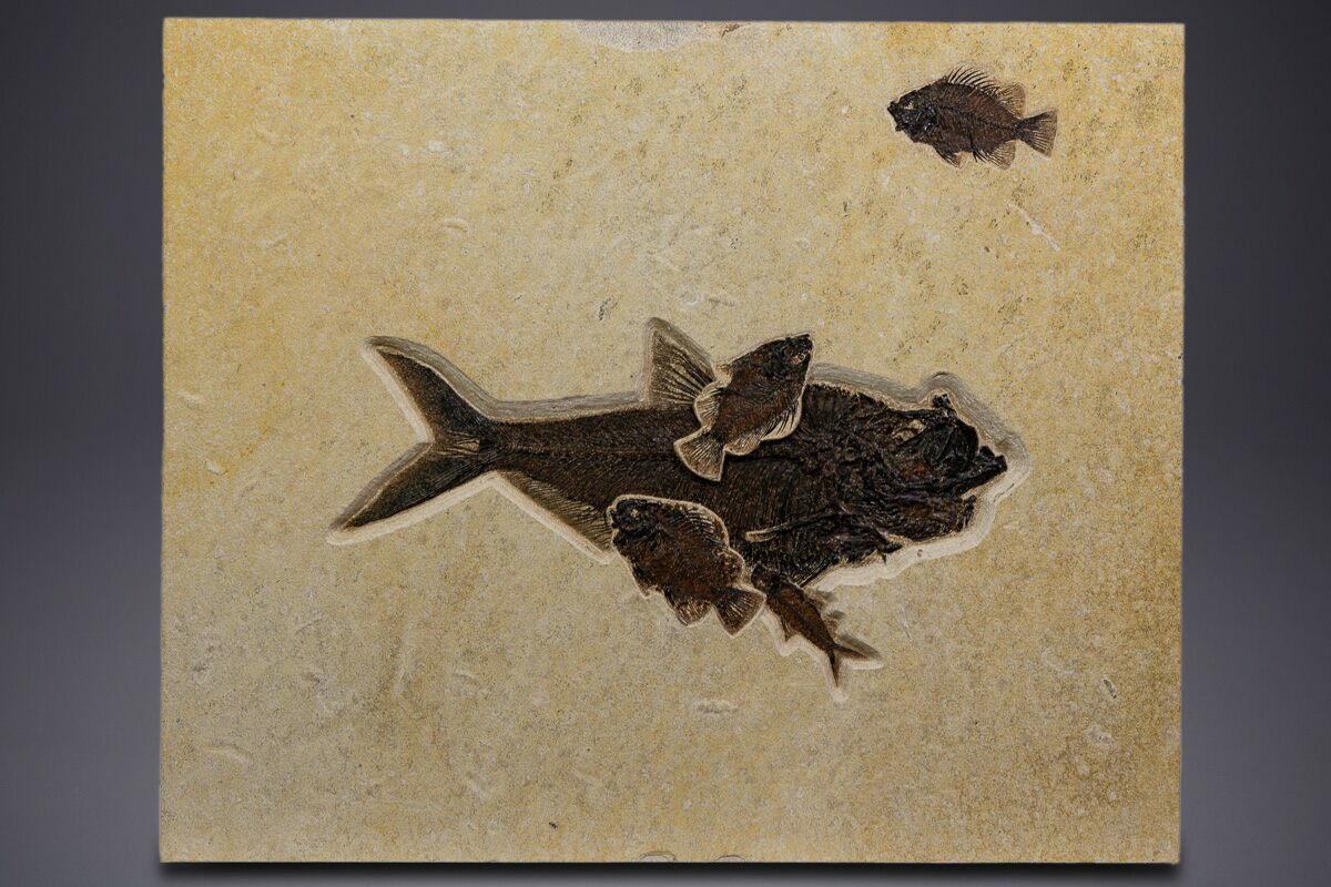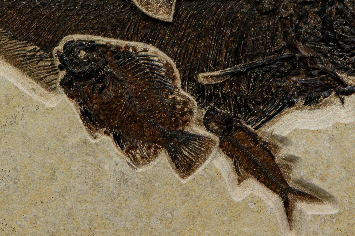 This is a one of a kind fossil fish "mural" from the Green River Formation of Wyoming. The entire mural measures 29" wide and displays multiple species of fish, all found naturally associated with each other. The species include Diplomystus dentatus, Cockerellites (Priscacara) liops, and Knightia eocaena. They have been skillfully prepared to show off these gorgeous fish split between multiple layers of rock, creating a naturally stacked presentation. The plate was collected from Clear Creek Quarry near Kemmerer, Wyoming.