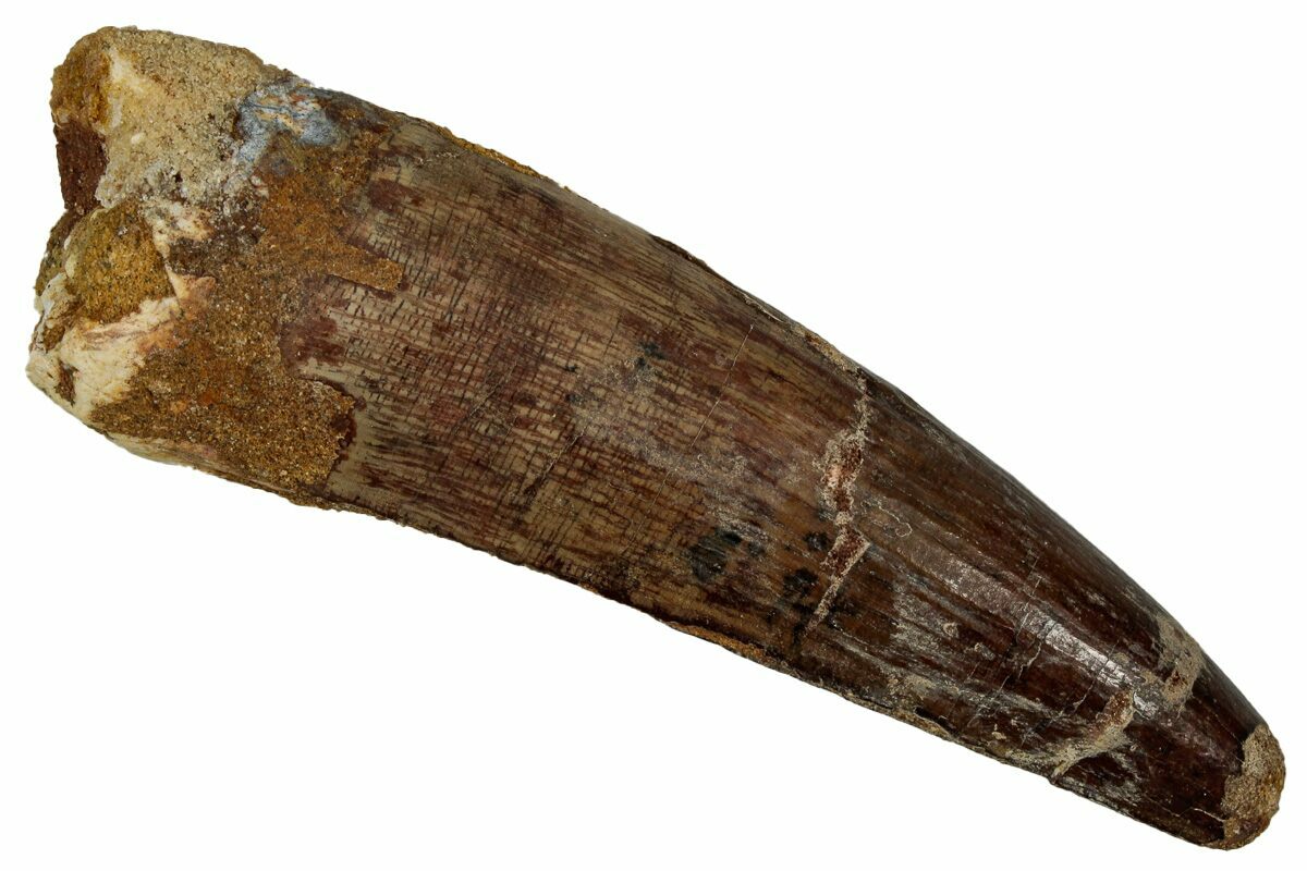 This is a 3.01" long Spinosaurus tooth from the Kem Kem Beds of Morocco. It is Late Cretaceous in age, approximately 95 million years old.