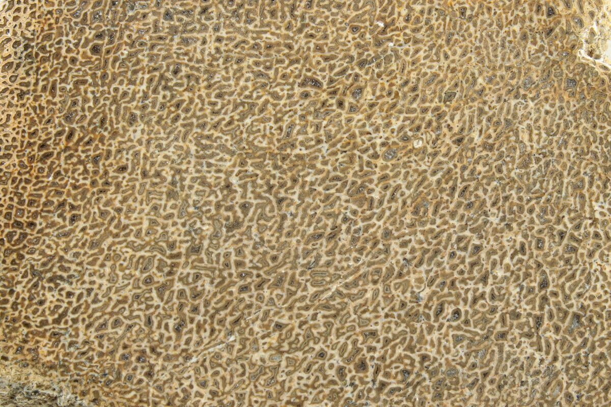 This is a 3.05" wide slab of agatized dinosaur bone that has been cut and polished on both sides to expose the inner cell structure. It has wonderful coloration and interesting structures. Based on the size of the cells as well as other features of the bone, it is almost certainly sauropod in origin.