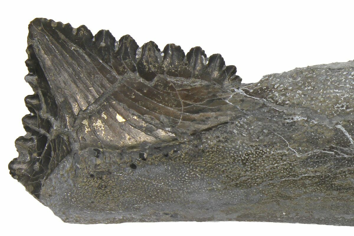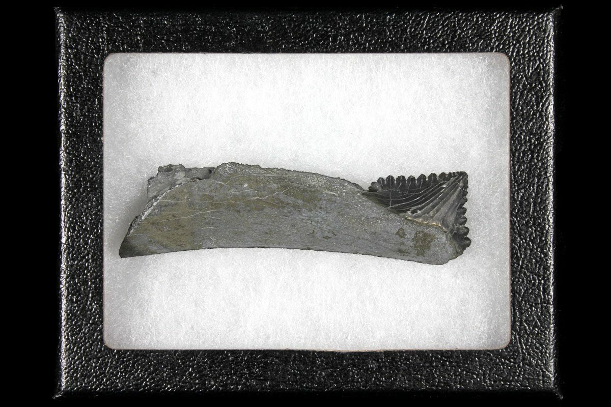 is a very unusual and hard to acquire offering of a fossil tooth and jaw section from the Carboniferous aged shark Edestus heinrichi. These rare teeth are recovered deep underground in the coal mines of Illinois. The tooth is in excellent condition with shiny grey enamel, well defined serrations and a nice tip. Most of these teeth are found broken or worn. Comes with a riker mount case.