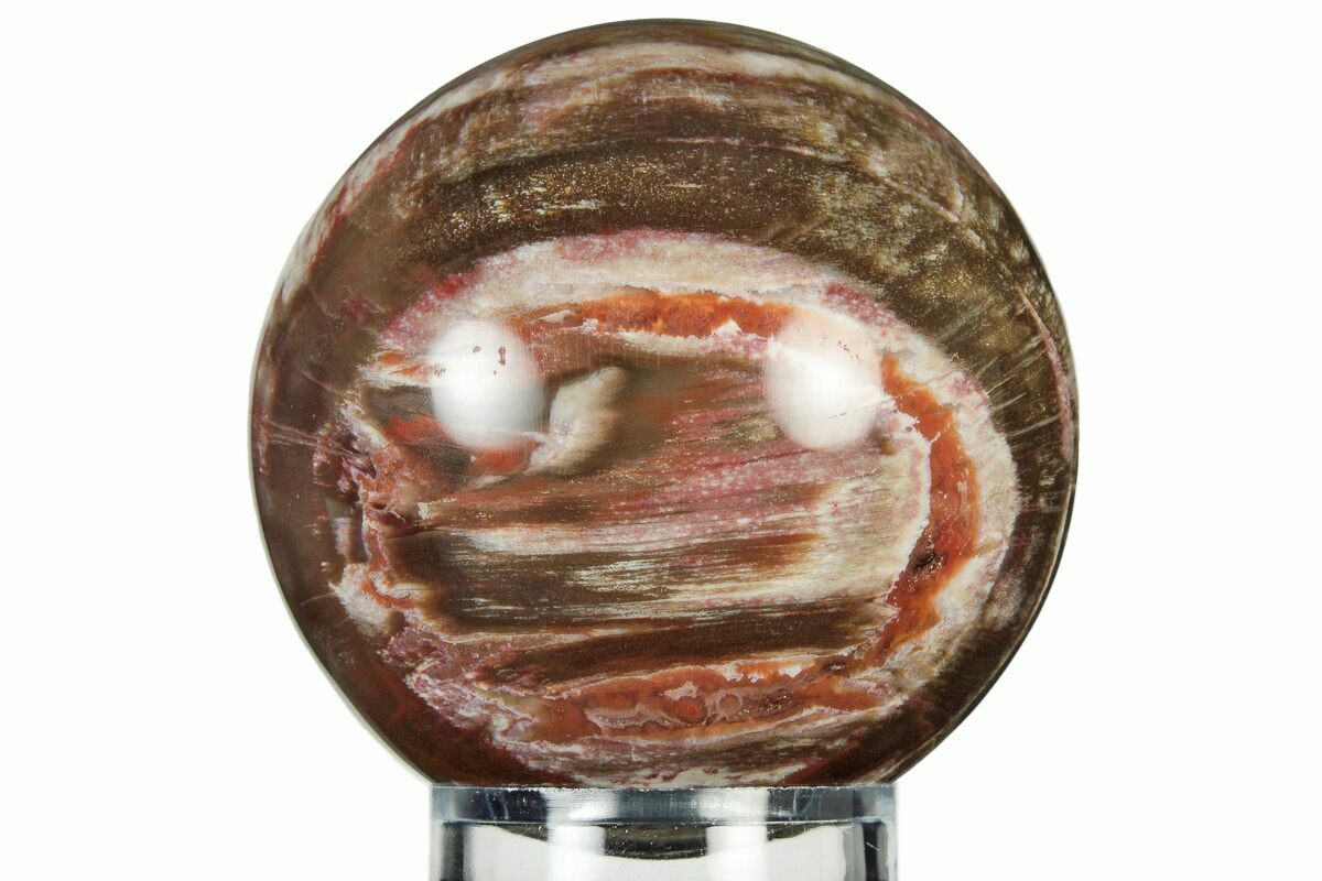 This is a colorful, 3.1" wide, polished sphere of petrified wood from Ambilobe, Madagascar. It is from the Araucaria tree, a type of conifer. The petrified wood is from the early Triassic period, approximately 220 million years old, close to the time the first dinosaurs appeared on the planet.