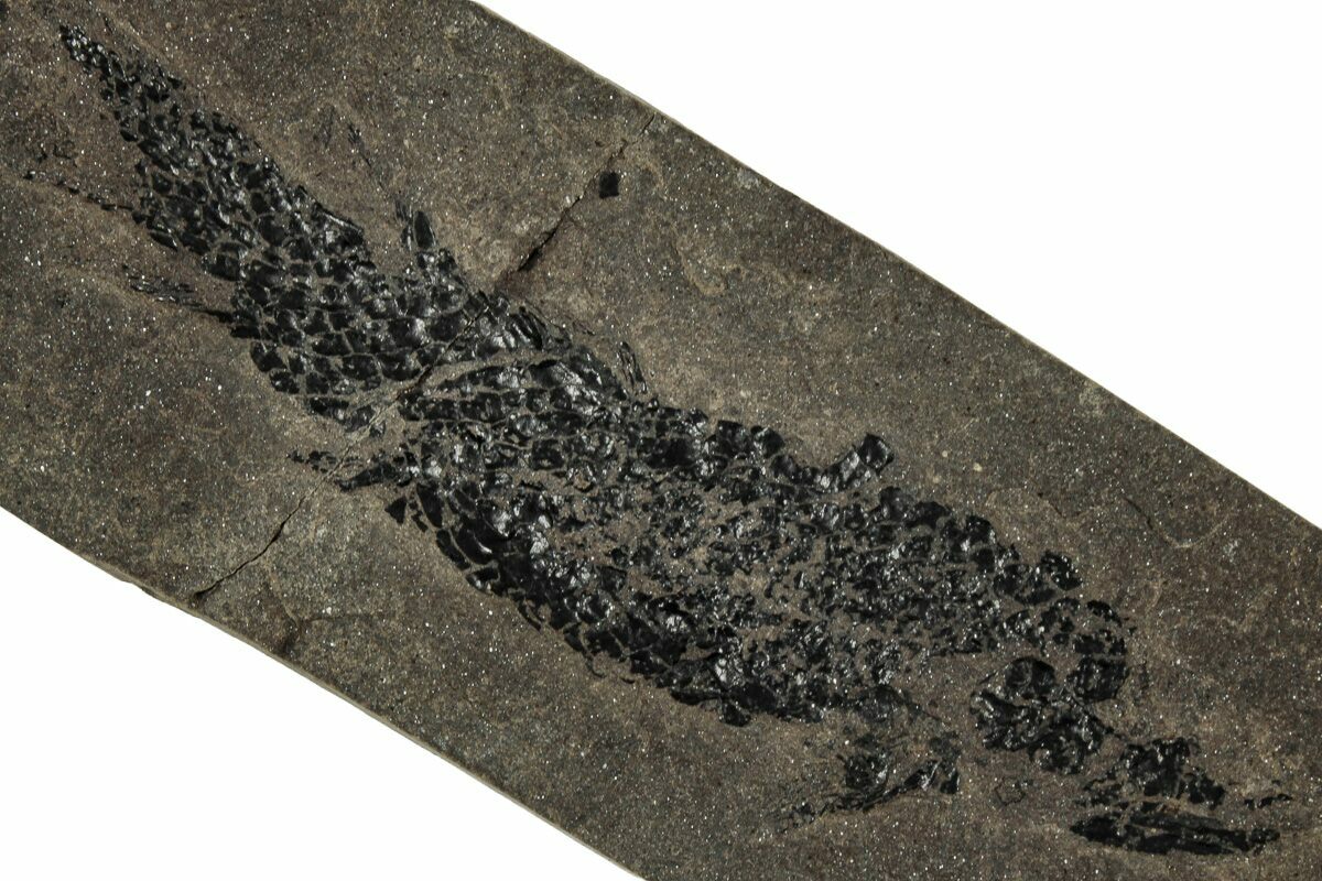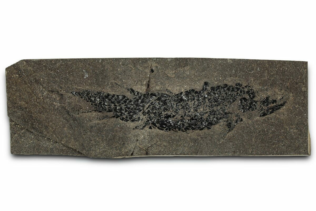 This is a 3.1" long specimen of the Devonian "Lobed-Fin" fish, Osteolepis panderi. It was collected from the Middle Devonian-aged Old Red Sandstone in Caithness, Scotland. It comes with an acrylic display stand.