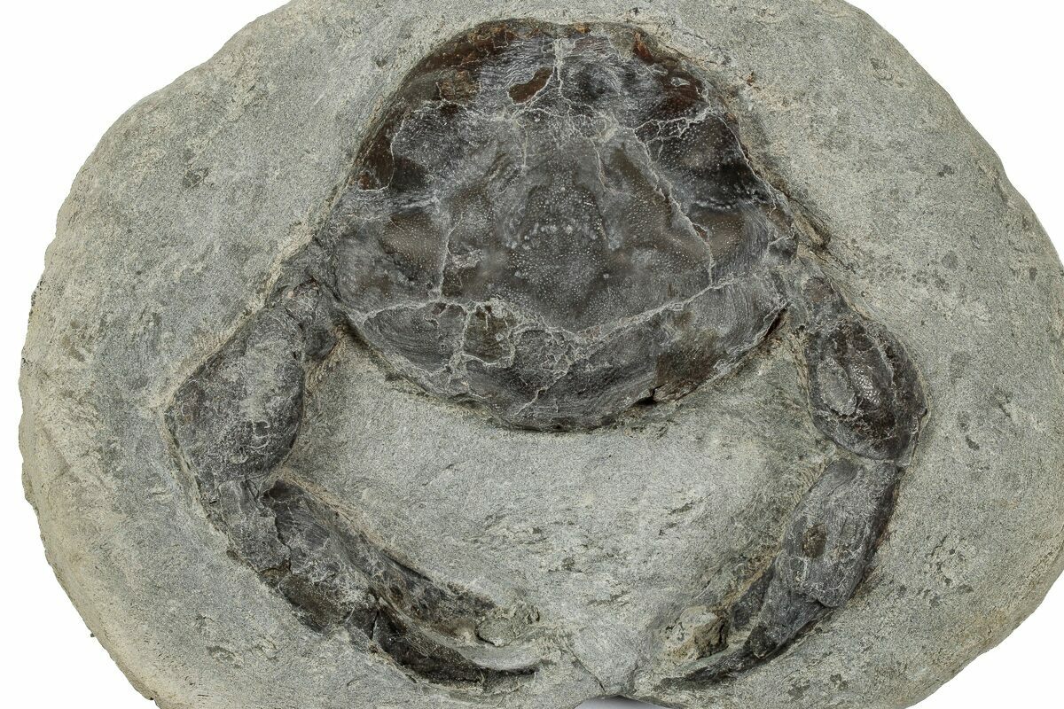 This is a wonderfully prepared example of the Late Eocene aged fossil crab Pulalius vulgaris. These crabs are found within hard concretions (a mass of rock that forms around organic manner) that erode out of the Lincoln Creek Formation, which must be broken open to find the crab. The crab must then be prepared from the hard concretion using mechanical tools, a very time consuming process.
