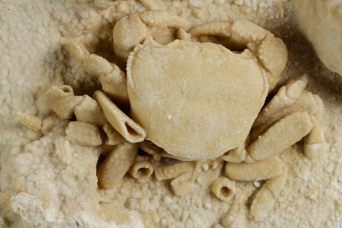 Travertine is a type of limestone that forms around mineral springs. It is often quarried for use as a building material, and that is how these crabs were discovered. They are found when hollow voids are cut into while sawing blocks of travertine. The travertine deposits in the Denizli Basin are Pleistocene in age, having been formed within the past 400,000 years.