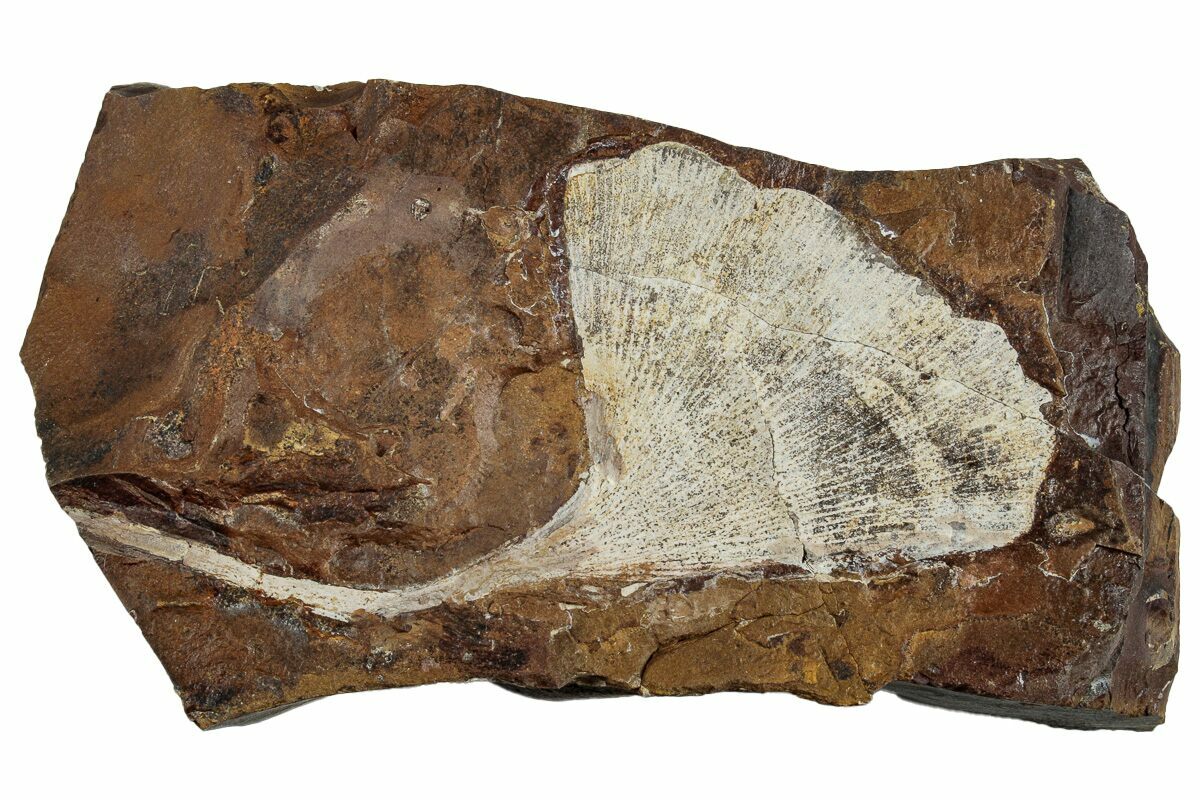 This is a fossil ginkgo leaf (Ginkgo cranei) from the Sentinel Butte Formation of North Dakota. They are finely detailed and the light preservation contrasts well against the dark orangish-brown rock.