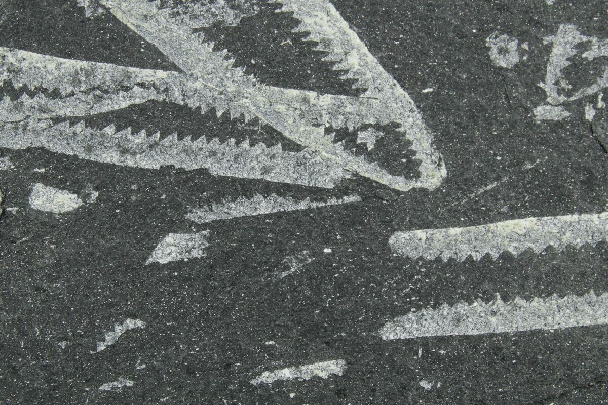 Graptolites are an extinct group of colonial, marine animals that thrived from the Cambrian through the Carboniferous period, reaching their peak diversity in the Ordovician. These ancient organisms are most commonly found as carbonized impressions on shale or slate, often appearing as fine, saw-blade or scribble-like markings on the rock surface.