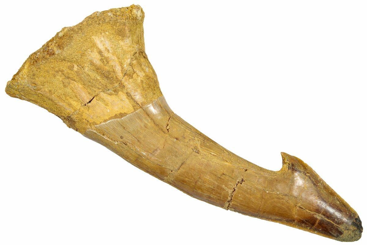 This is a 3.1" long rostral barb/tooth from an extinct, giant sawfish (Onchopristis numidus). It was collected from the Kem Kem Beds in Taouz, Morocco. There are multiple repaired cracks and damage to the tip of this specimen.