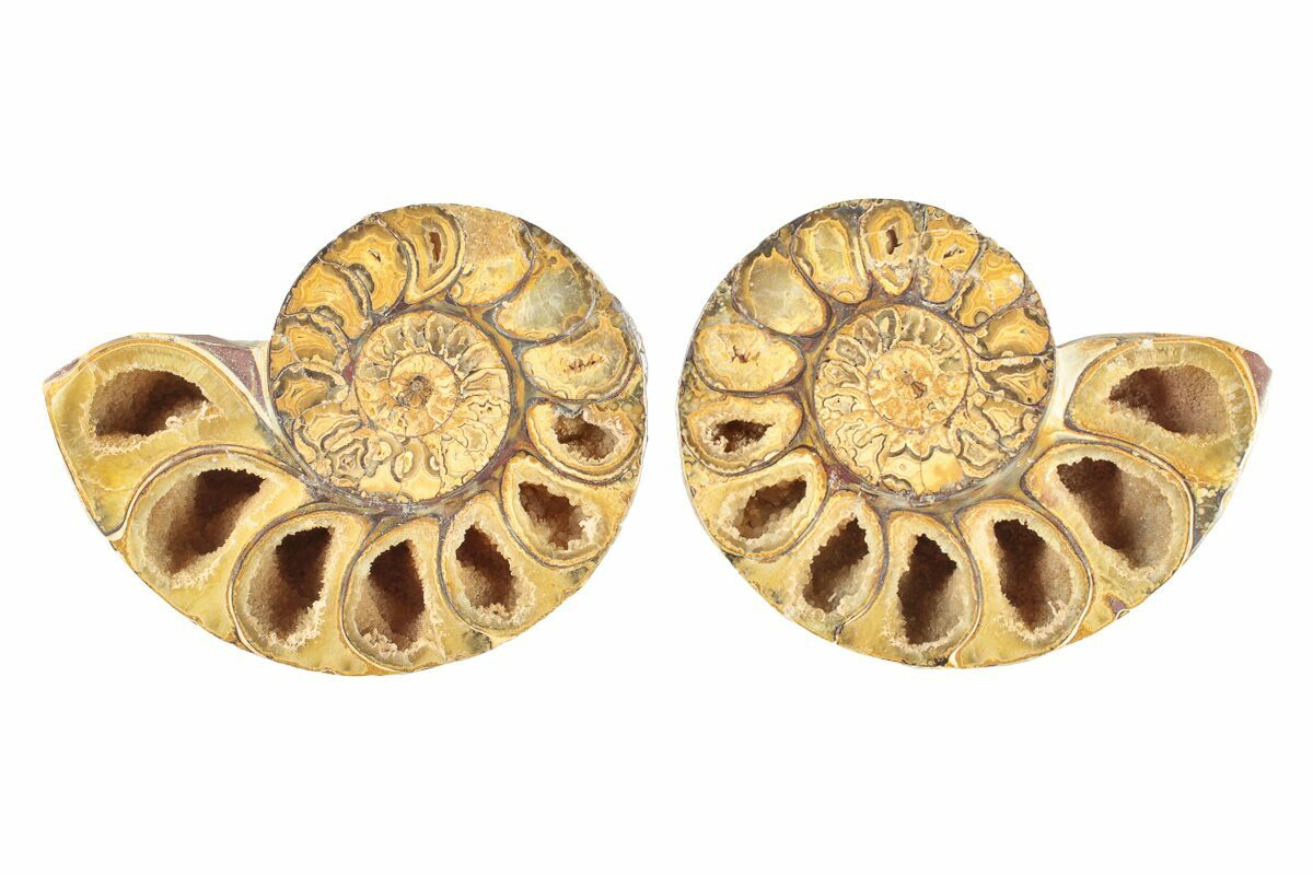 The previously hollow chambers of the ammonite were replaced with a beautiful agate during the fossilization process. Some of these chambers are still partially hollow and lined with druzy crystals. The ammonite was cut in half and polished revealing the inner chamber structure of this ancient marine animal. Both halves are included and they come with a pair of display stands.