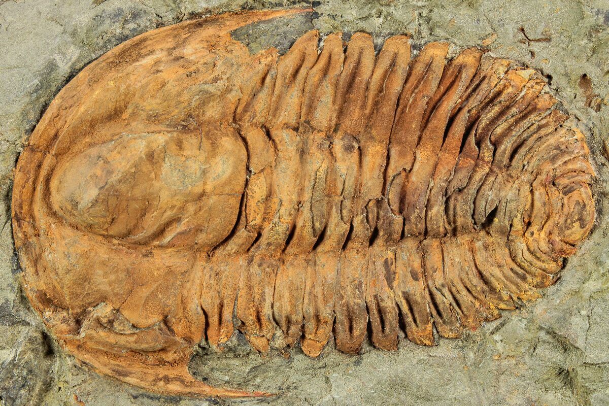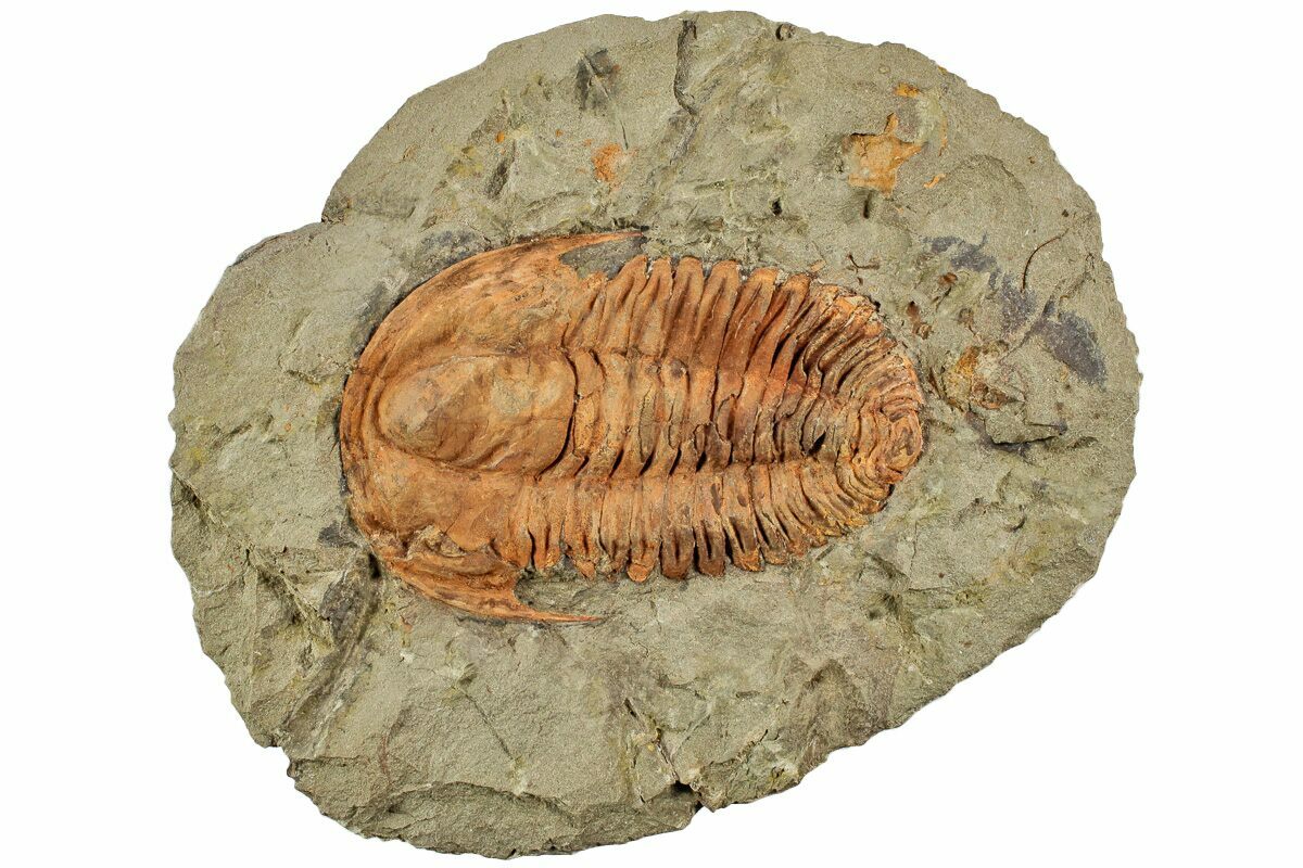 This is an orange, 3.1" long Hamatolenus trilobite from Tinjdad, Morocco. The bright orange coloration is natural and due to the oxidization of iron pyrite into limonite.