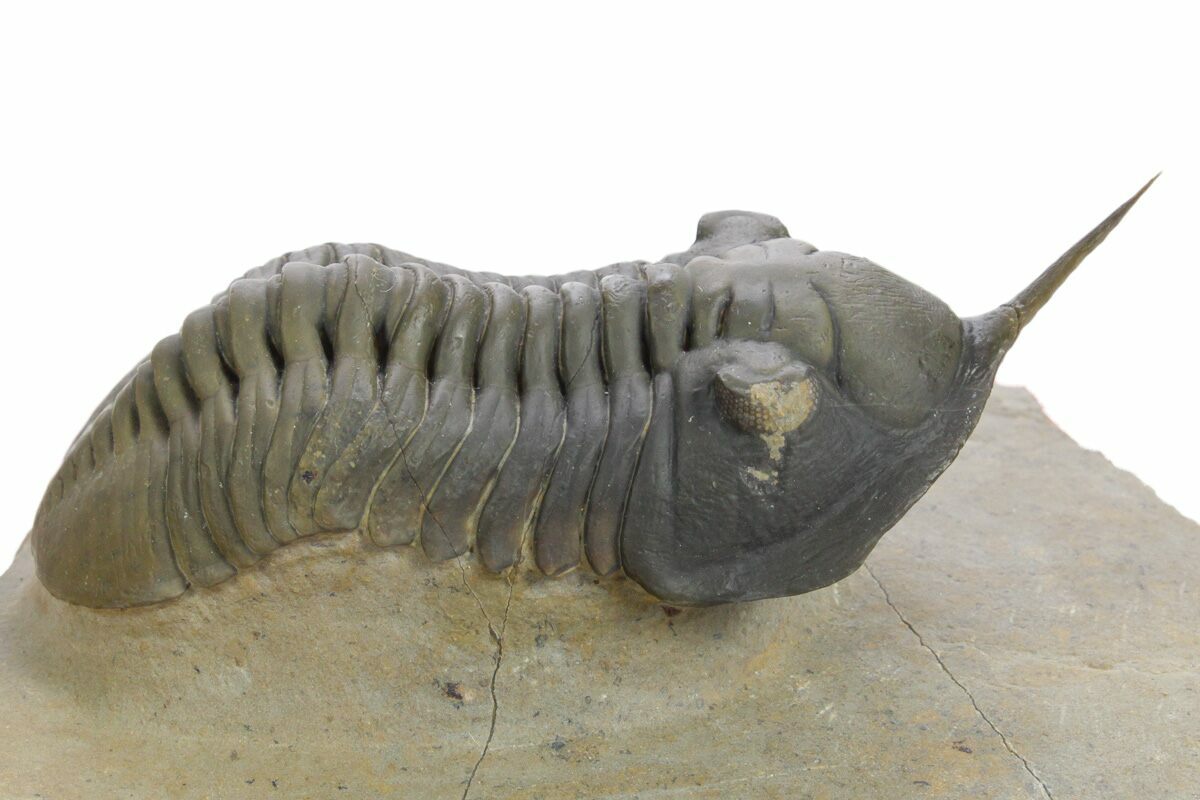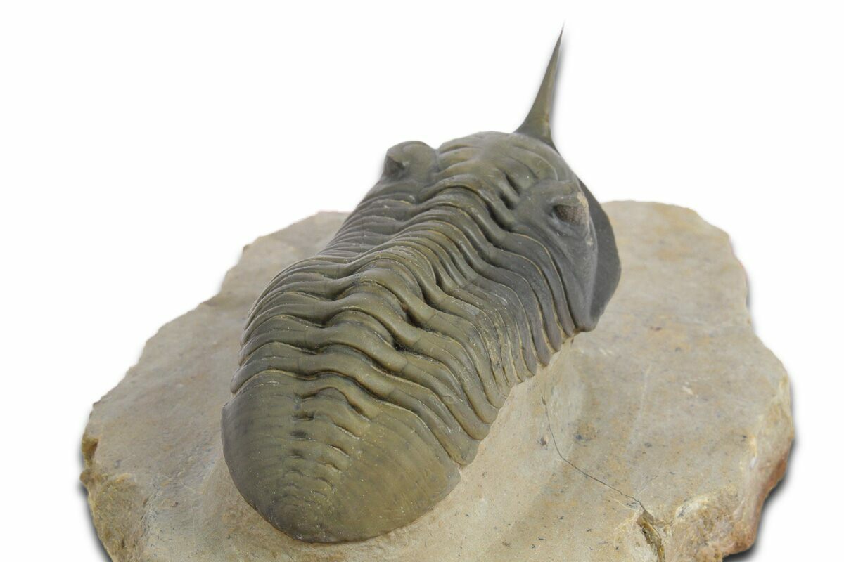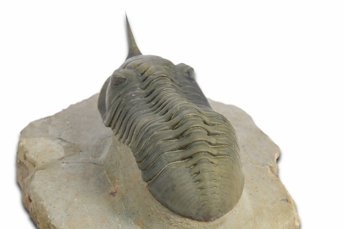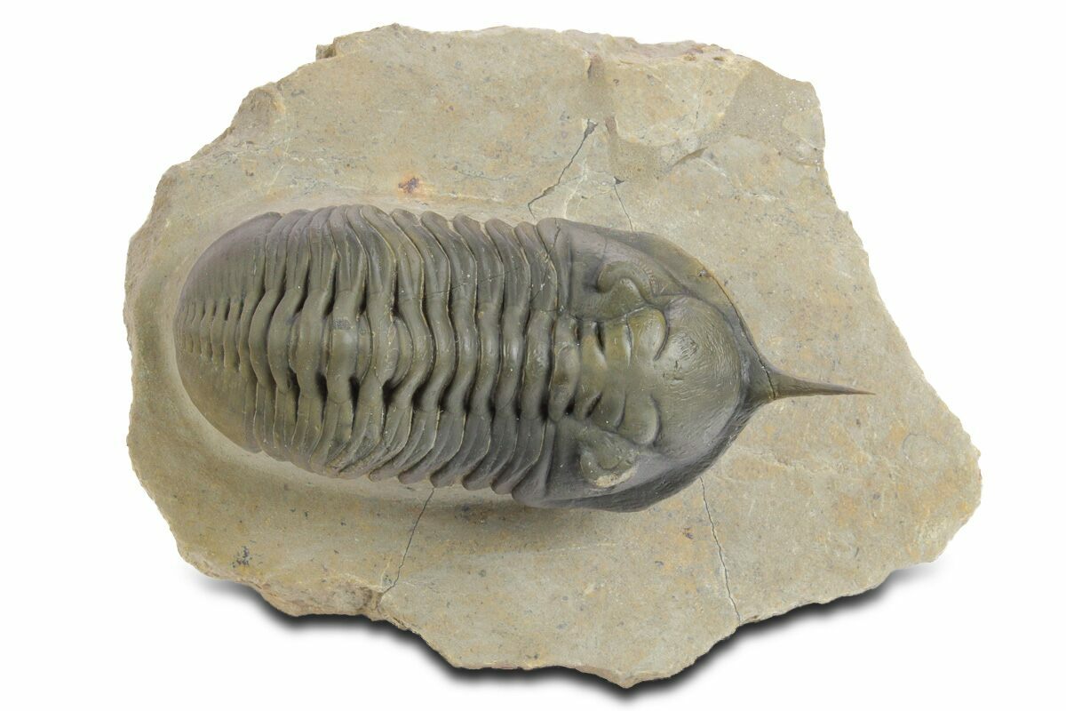 Here is a 3.1" long, phacopid trilobite (Morocconites malladoides) quarried from the deposits near Ofaten, Morocco. This is a member of the Phacopida trilobites and has a very defining feature, a long pointed rostrum (snout) coming off of its head. It's unclear what purpose this rostrum would have served, but it could have potentially been used to help it dig through the mud.
