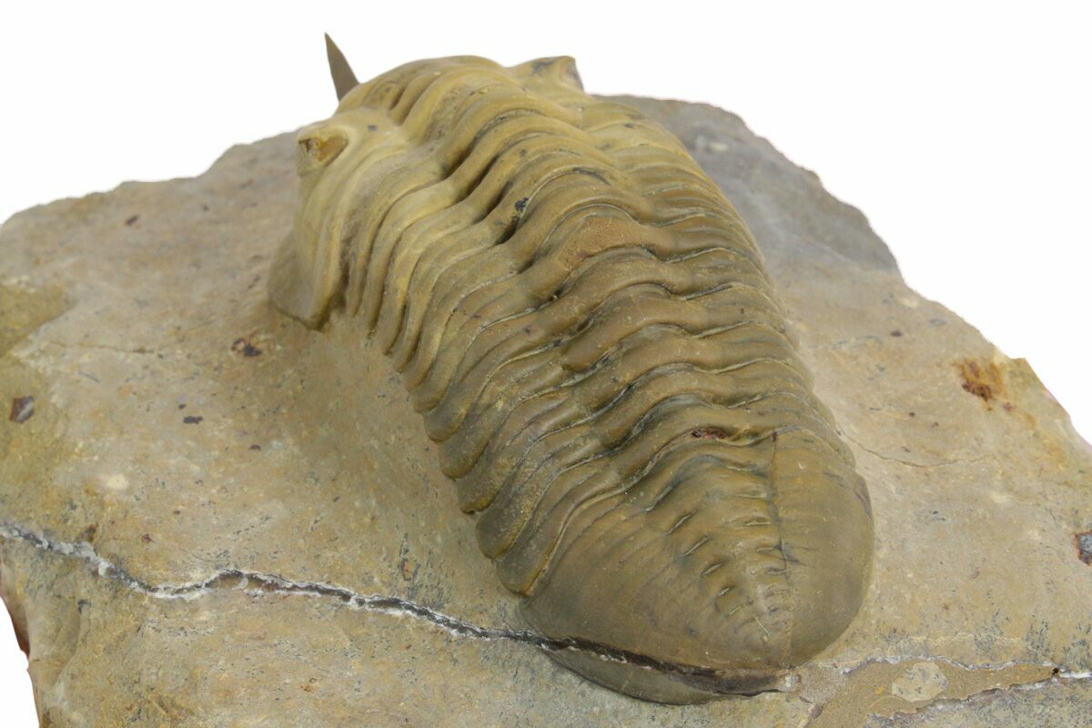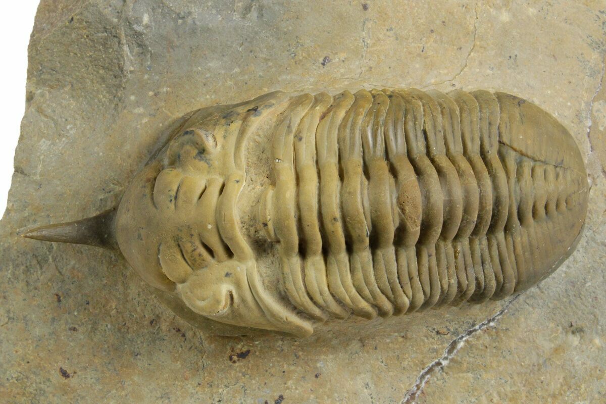 Here is a 3.1" long, phacopid trilobite (Morocconites malladoides) quarried from the deposits near Ofaten, Morocco. This is a member of the Phacopida trilobites and has a very defining feature, a long pointed rostrum (snout) coming off of its head. It's unclear what purpose this rostrum would have served, but it could have potentially been used to help it dig through the mud.