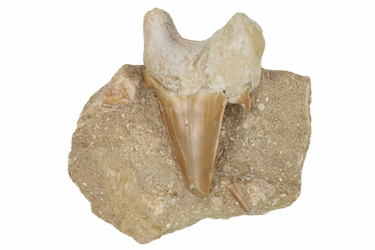 This is a large, 3.1" fossil tooth of the extinct, giant mackerel shark, Otodus obliquus, from the phosphate deposits in the Oulad Abdoun Basin of Morocco. It is Eocene in age, or approximately 54 million years old. The tooth is only partially exposed from the rock in which it was found.