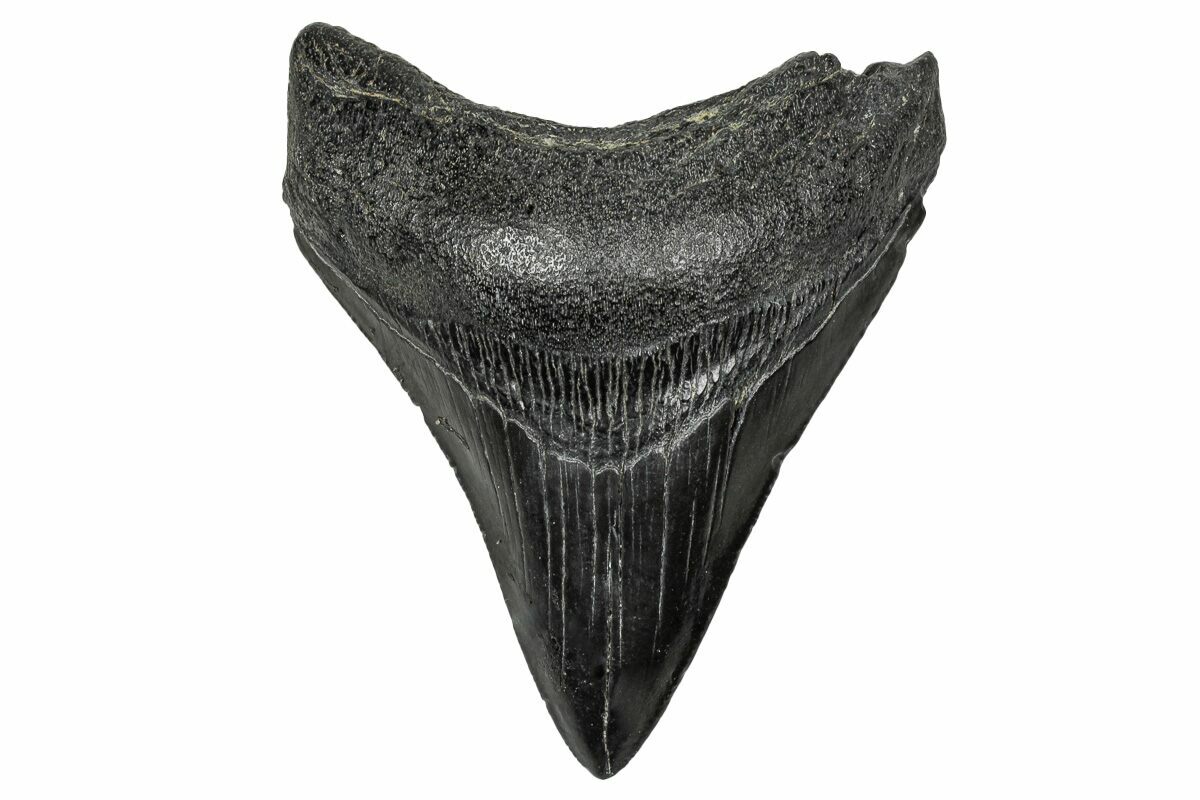 The standard measure for megalodon teeth is slant height, or the longest edge of the tooth. Adult megalodon teeth were typically in the 4 to 5 inch range: teeth over 6 inches are rare and represent super-sized individuals. Only a handful of teeth have ever been found over seven inches.