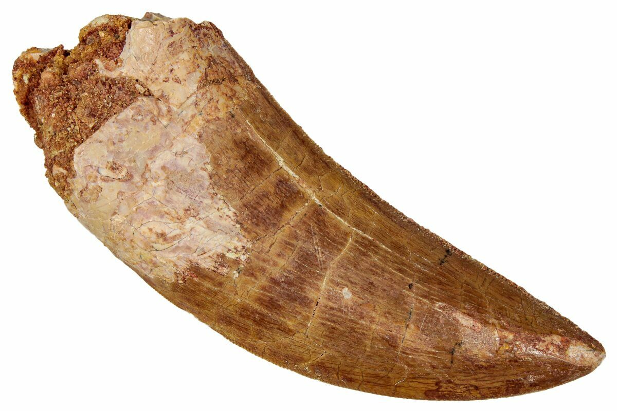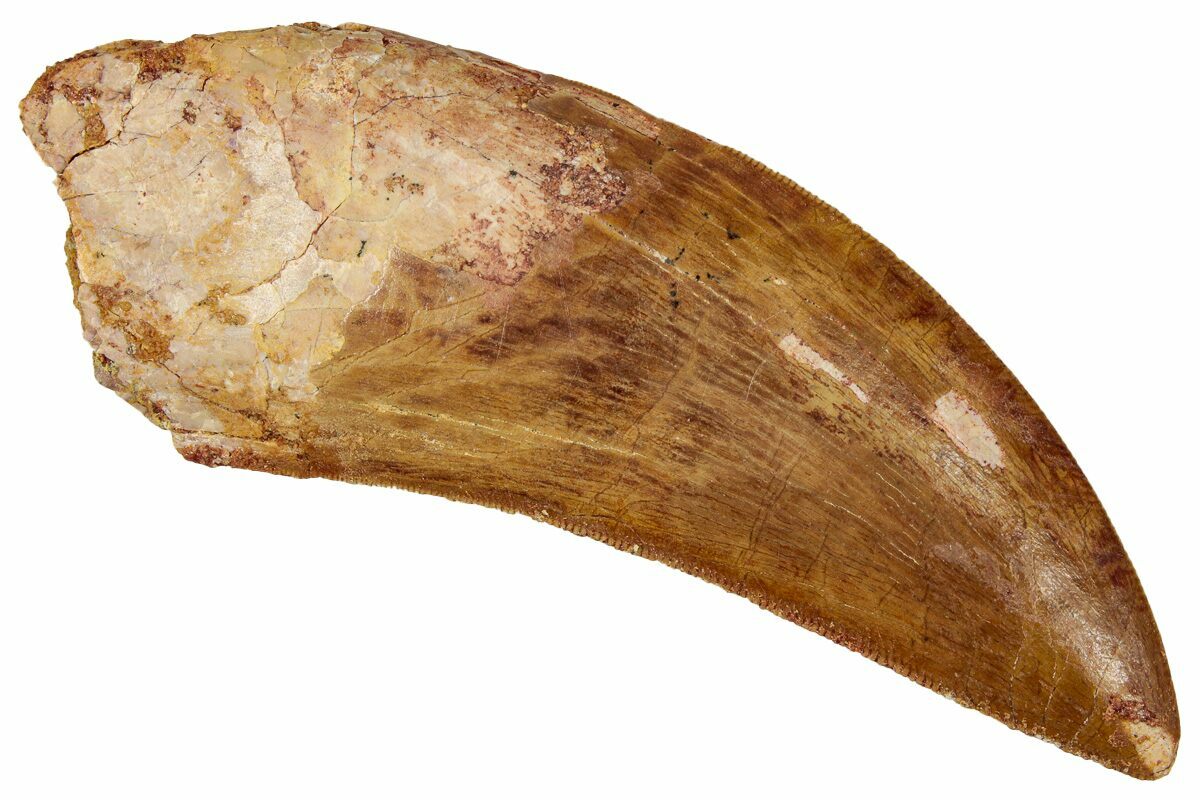 This is a good-sized, serrated, 3.13" long tooth of a Carcharodontosaurus from the Late Cretaceous Kem Kem Beds of Morocco. Carcharodontosaurus was a massive predatory dinosaur larger than Tyrannosaurus rex.