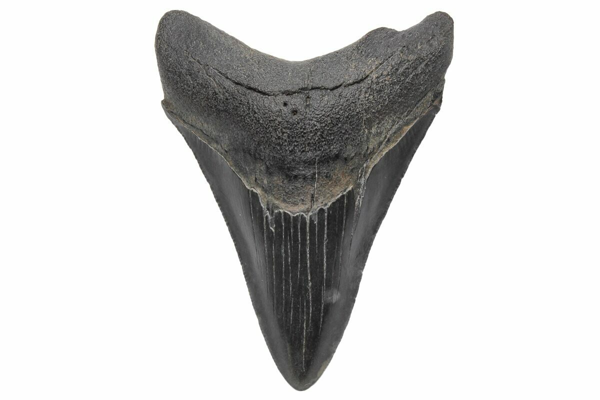 The standard measure for megalodon teeth is slant height, or the longest edge of the tooth. Adult megalodon teeth were typically in the 4 to 5 inch range: teeth over 6 inches are rare and represent super-sized individuals. Only a handful of teeth have ever been found over seven inches.