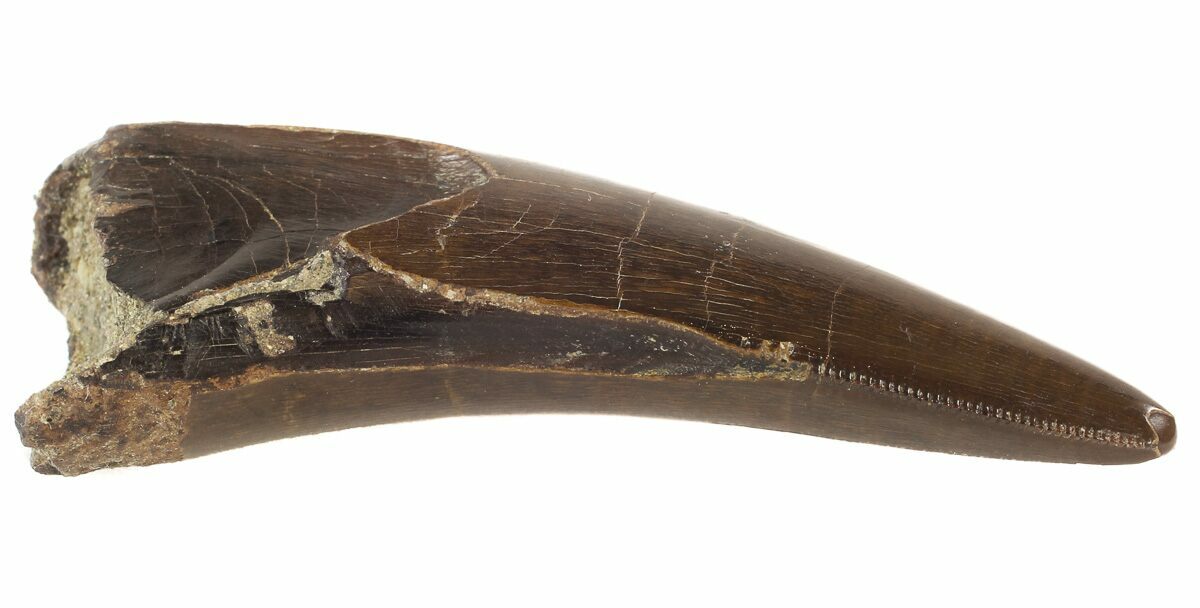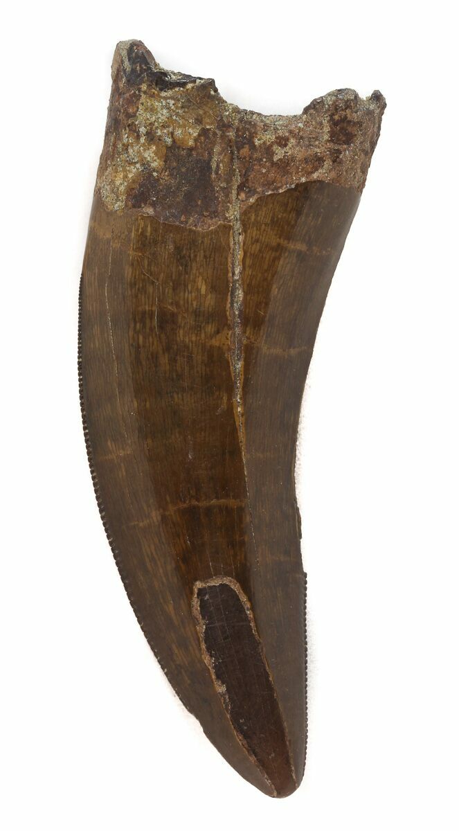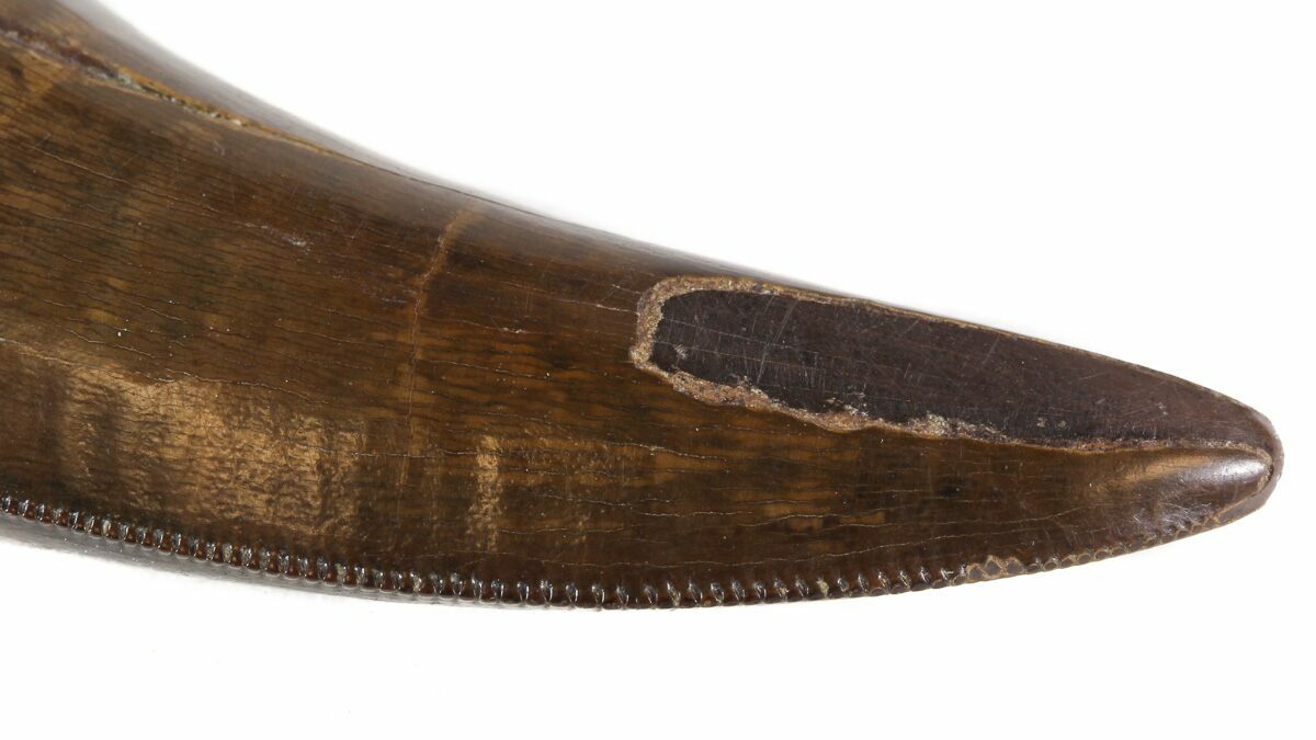 There serrations on the outer edge are in great shape with only a few near the tip worn. There is a wear facet on one side of the tooth near the tip where it was rubbing against another tooth in the dinosaurs mouth. About 1/3 of the inner serrations are present near the tip, while a thin section of the inner edge on the lower portion of tooth has sheered away, likely when the tooth was lost from the beasts mouth during feeding.