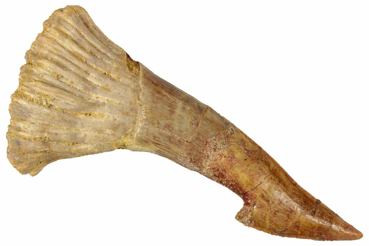 This is a 3.15" long rostral barb/tooth from an extinct, giant sawfish (Onchopristis numidus). It was collected from the Kem Kem Beds in Taouz, Morocco.