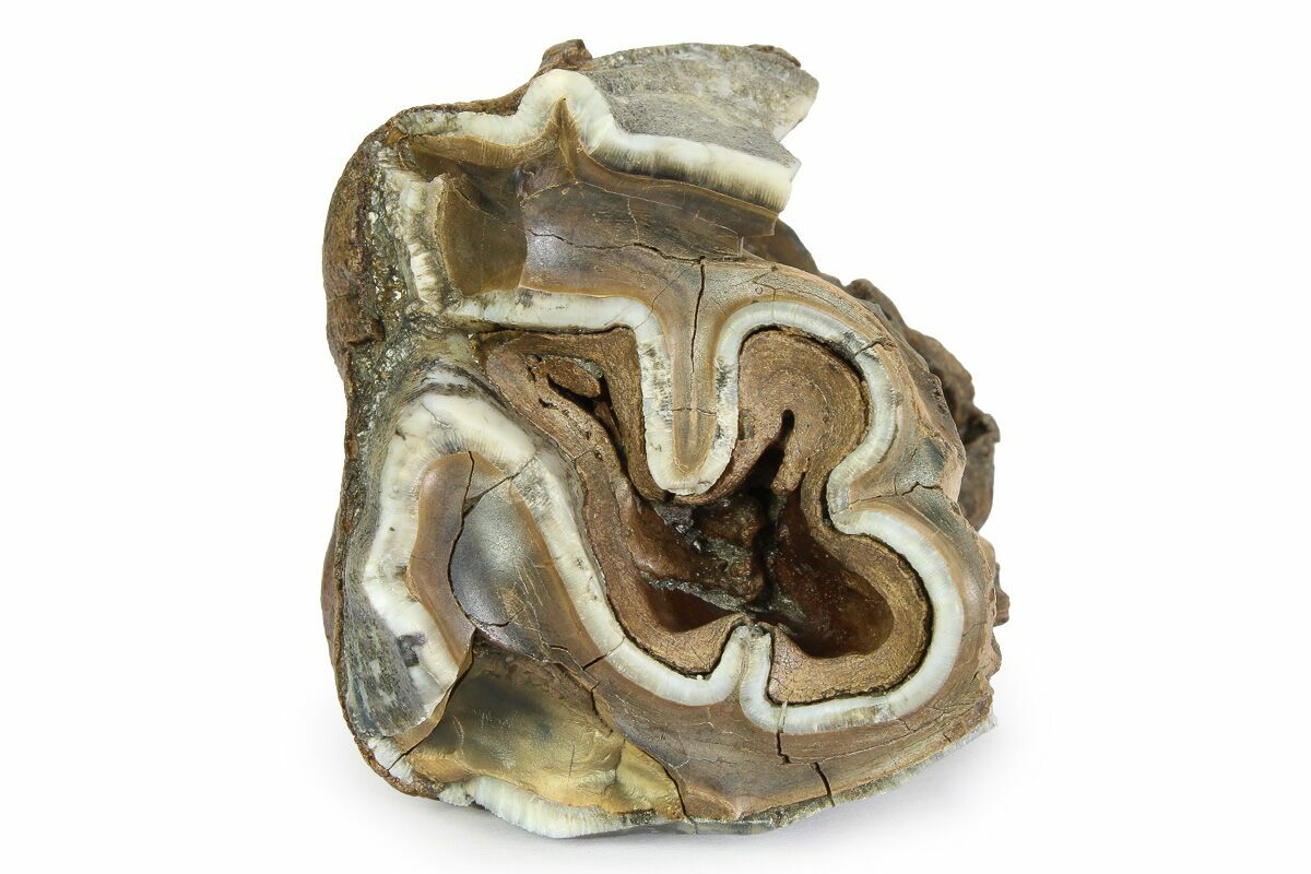 This is a fossil tooth from a woolly rhinoceros (Coelodonta antiquitatis). The fossil comes from Siberia, Russia, where many woolly mammoth and woolly rhino fossils are unearthed. Including the partial root, the tooth measures 3.15" tall.