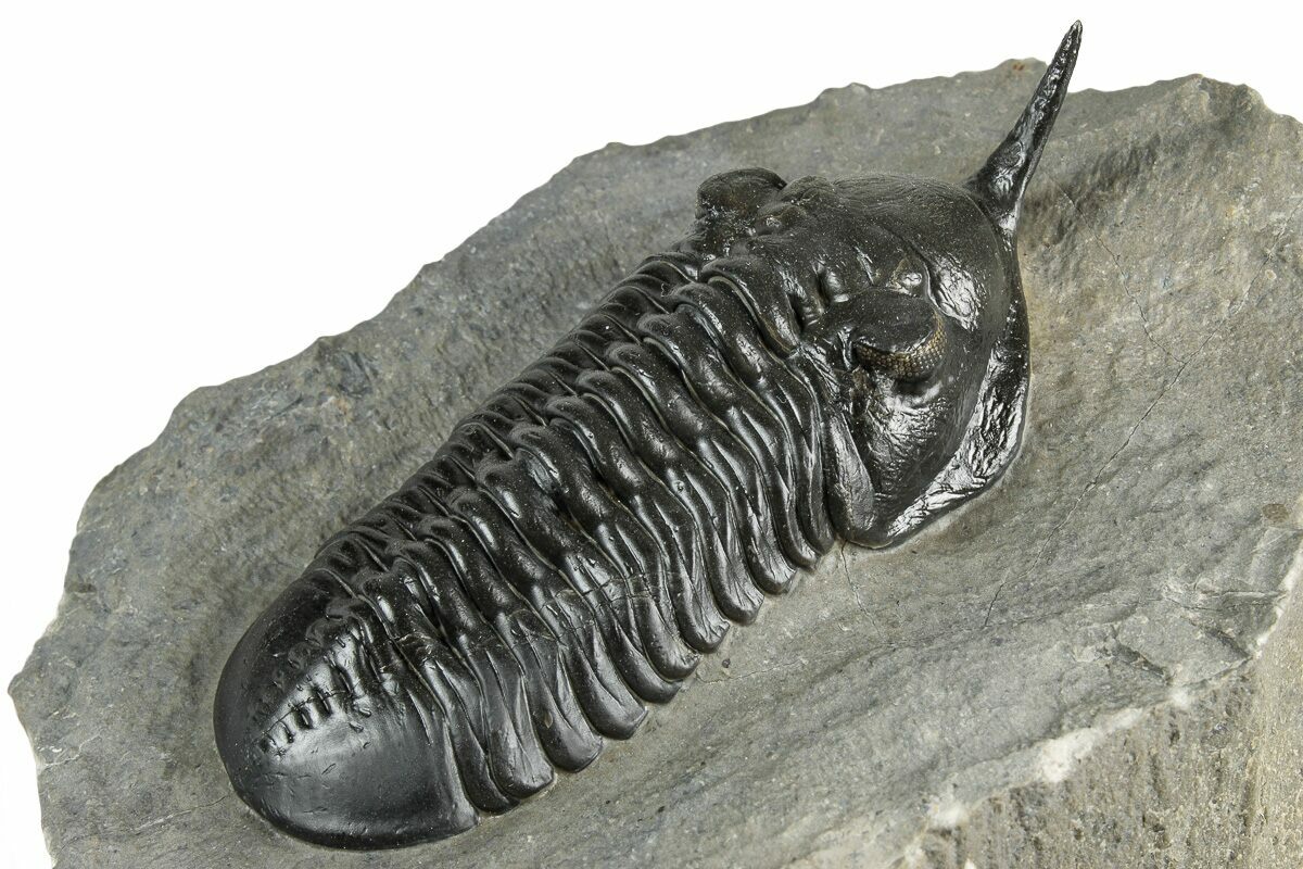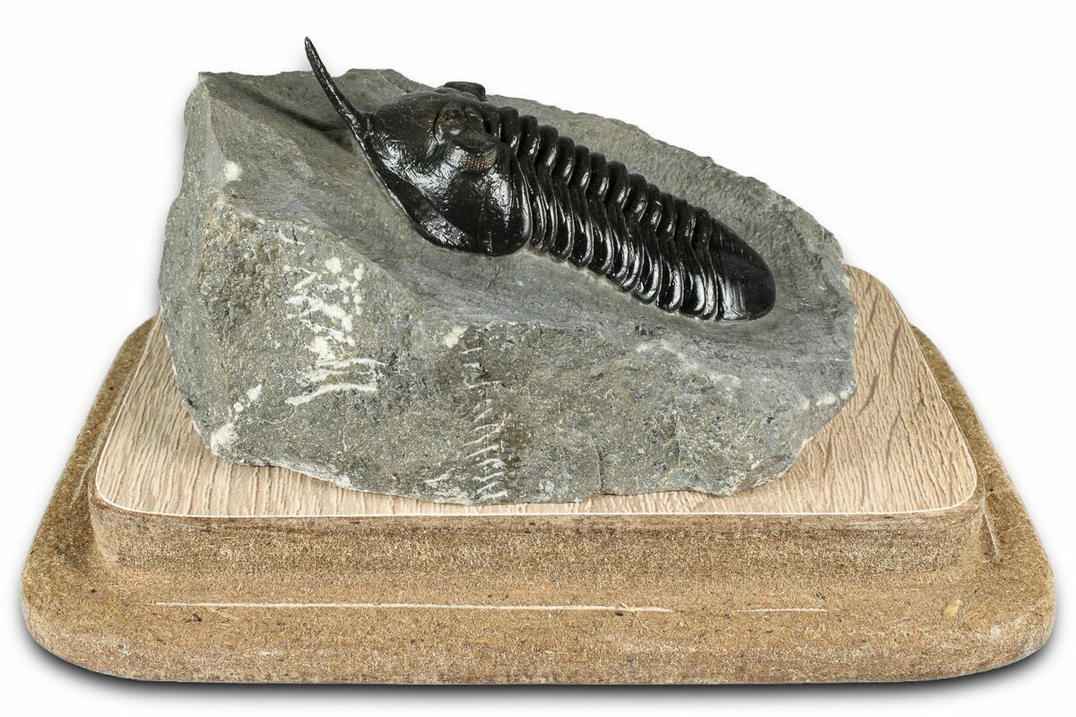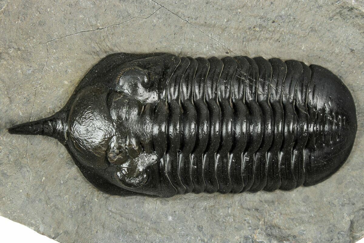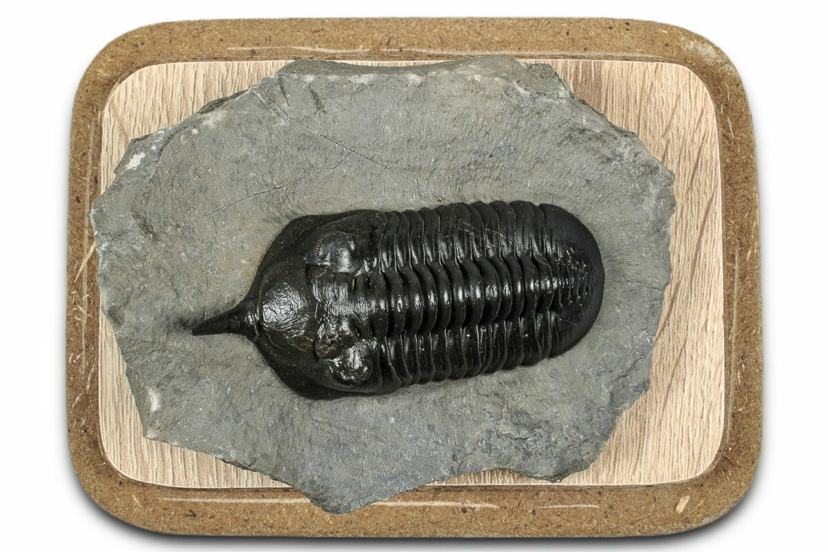 Here is a 3.15" long, phacopid trilobite (Morocconites malladoides) quarried from the deposits near Ofaten, Morocco. This is a member of the Phacopida trilobites and has a very defining feature, a long pointed rostrum (snout) coming off of its head. It's unclear what purpose this rostrum would have served, but it could have potentially been used to help it dig through the mud.