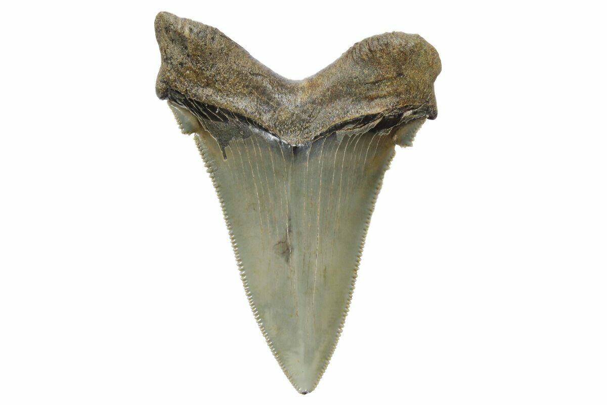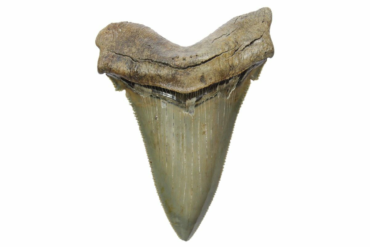 This is a serrated, 3.17" long fossil Otodus angustidens shark tooth. Angustidens is believed to be an ancestor of the fearsome megalodon shark, though it did not grow nearly as large.