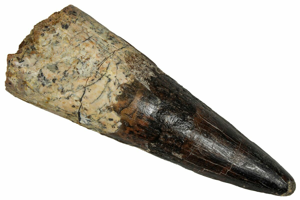 This is a 3.18" long Spinosaurus tooth from the Kem Kem Beds of Morocco. It is Late Cretaceous in age, approximately 95 million years old.