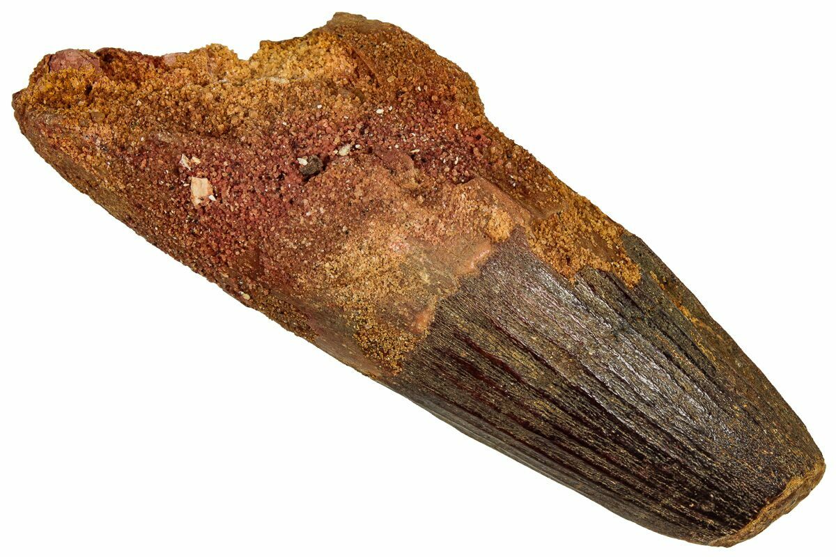 Spinosaurus teeth are relatively common fossils, but large (3+ inches), well-preserved examples are rare. These large Spinosaurus teeth will often be heavily doctored. We’ve seen many examples where multiple partial teeth can been glued to together to create a larger fake tooth, or where enamel has been painted on. One giveaway to look for is a ring of sand around the middle of the tooth, usually glued on to hide a break. Sometimes this is a sign that multiple partial teeth have been composited, but other times it is used to disguise a badly done repair job.