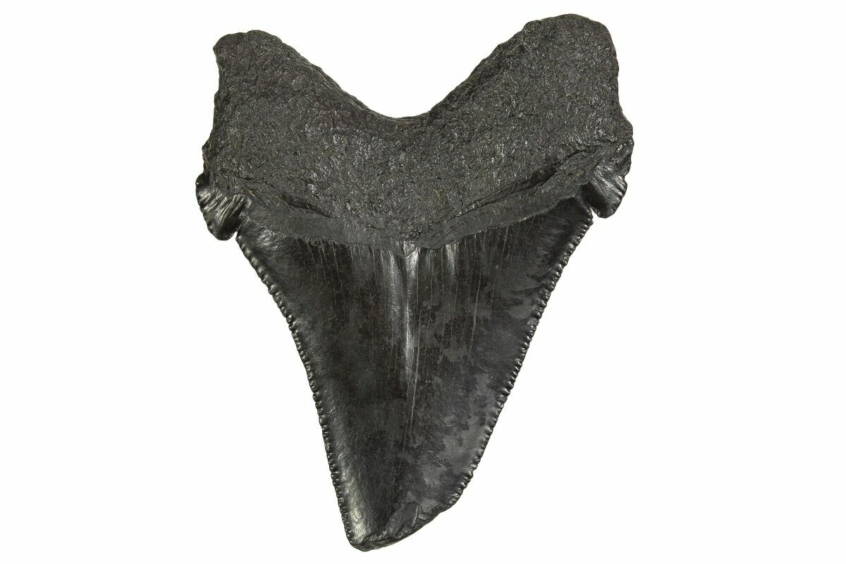 This is a serrated, 3.190" long fossil Otodus angustidens shark tooth. Angustidens is believed to be an ancestor of the fearsome megalodon shark, though it did not grow nearly as large.