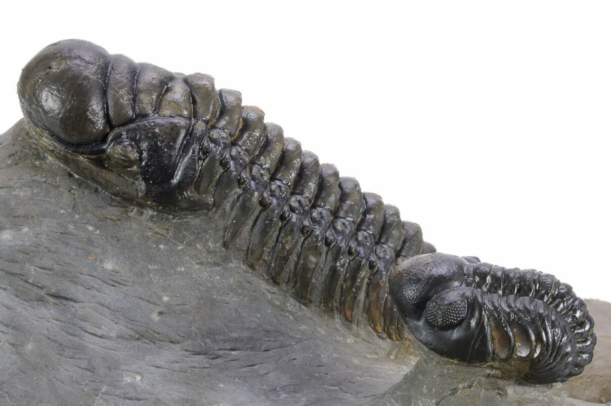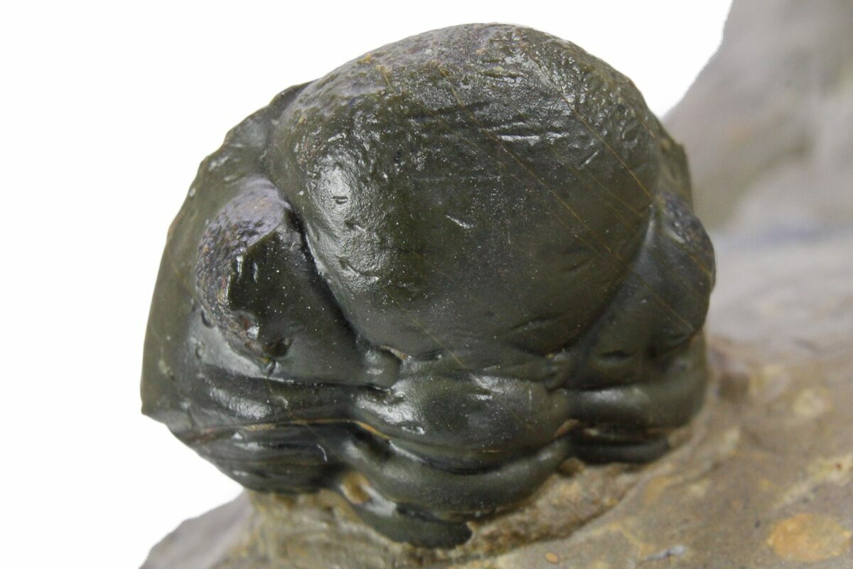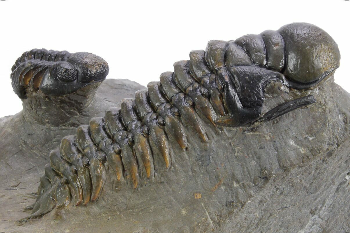 This is a 3.2" long Crotalocephalina gibbus trilobite fossil naturally associated with a pair of Reedops. The Crotalocephalina is prone while one Reedops is curled and one is enrolled. There is no restoration on this piece.