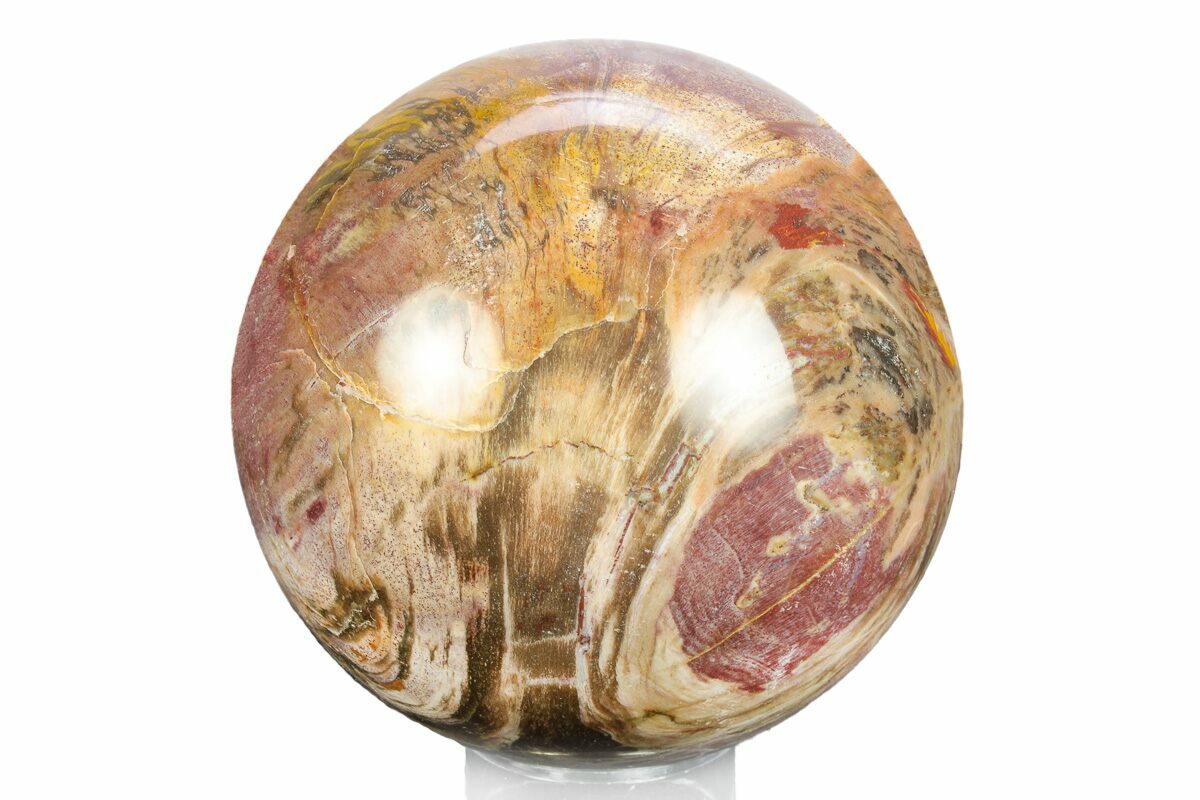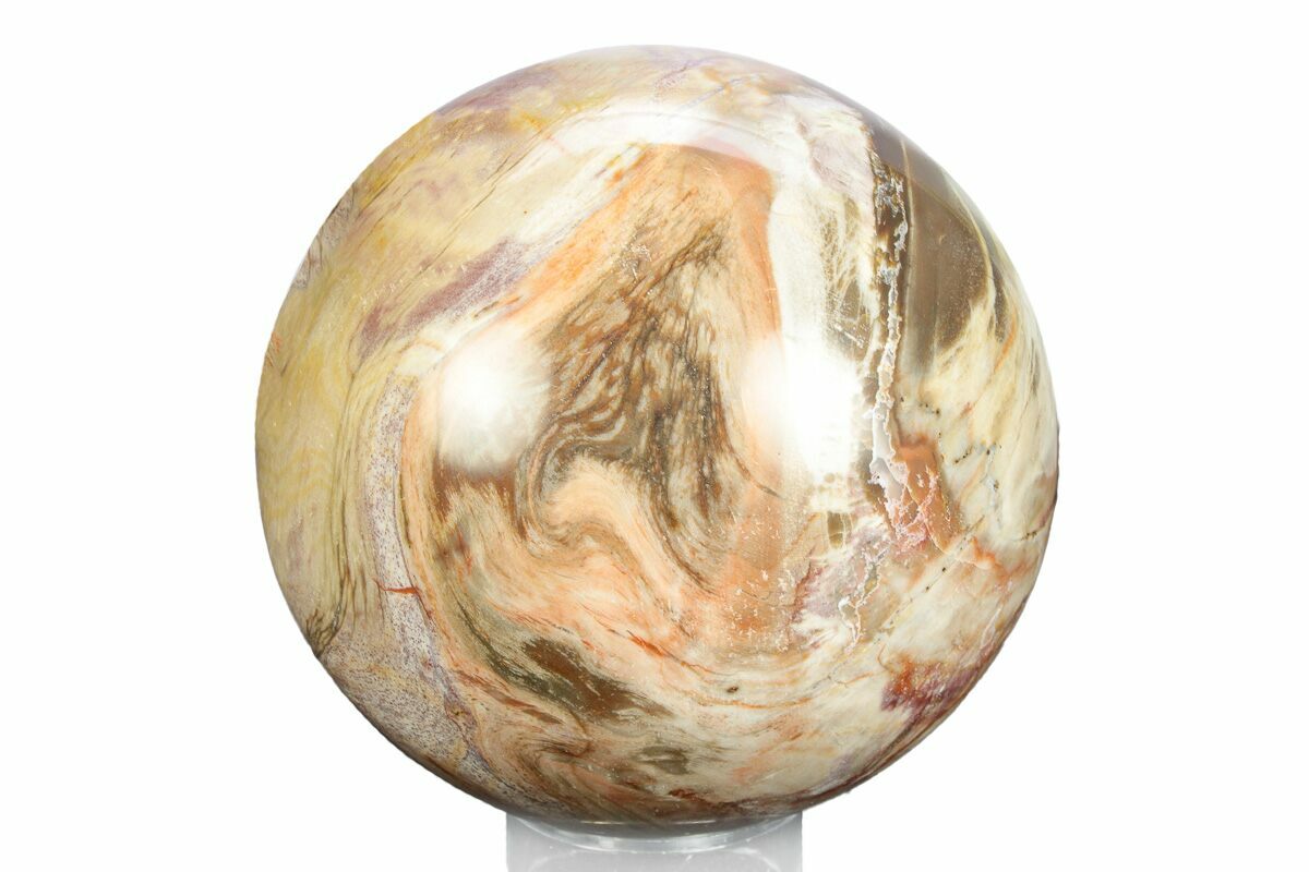 This is a colorful, 3.2" wide, polished sphere of petrified wood from Ambilobe, Madagascar. It is from the Araucaria tree, a type of conifer. The petrified wood is from the early Triassic period, approximately 220 million years old, close to the time the first dinosaurs appeared on the planet.