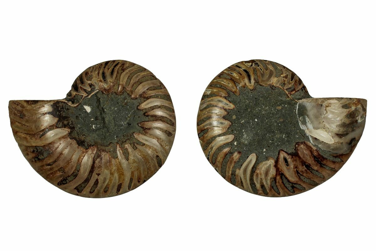 his is a beautiful 3.2" wide, cut and polished Cleoniceras ammonite from Ambatolafia, Madagascar, dating to the Albian Stage of the Late Cretaceous (~110 million years old). Its chambers reveal striking mineralization bordered by white calcite septa, creating an elegant, highly polished display piece. Both halves are included, along with display stands.