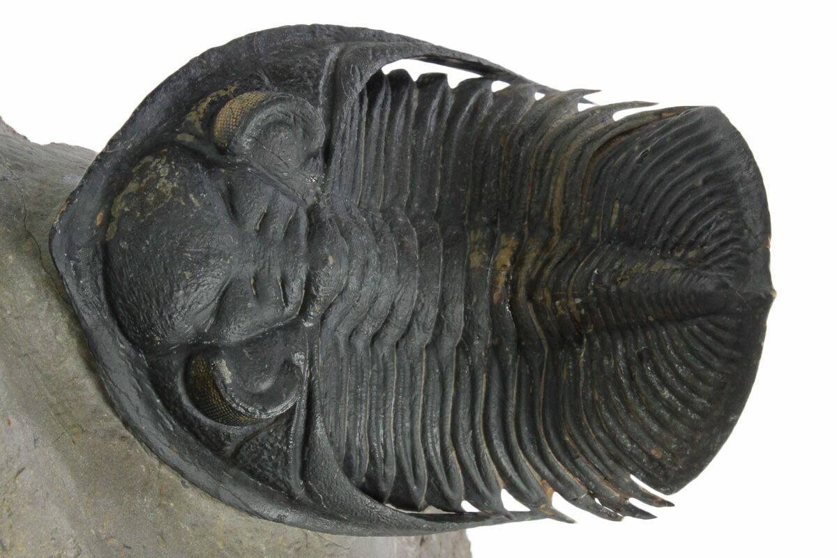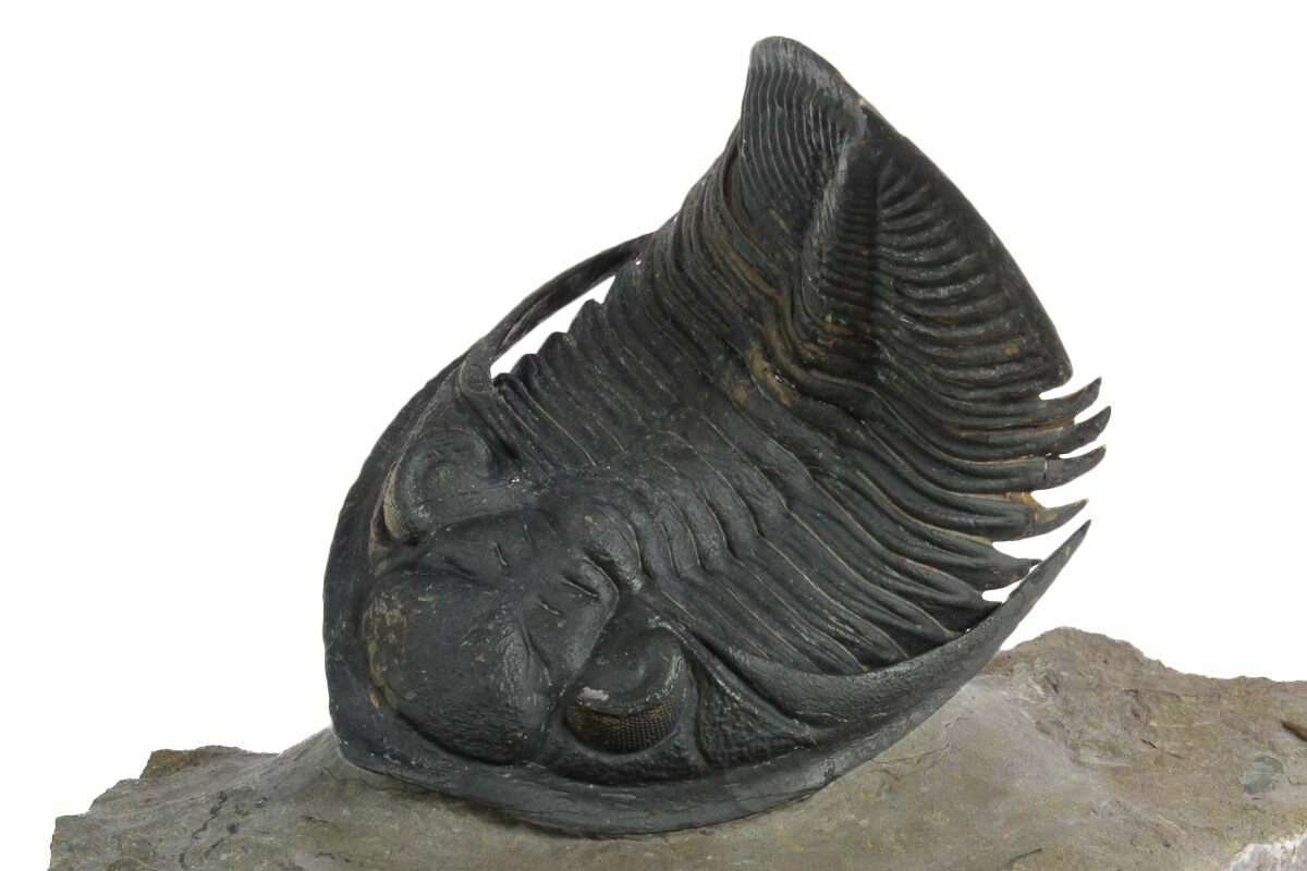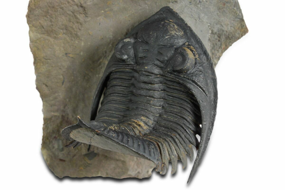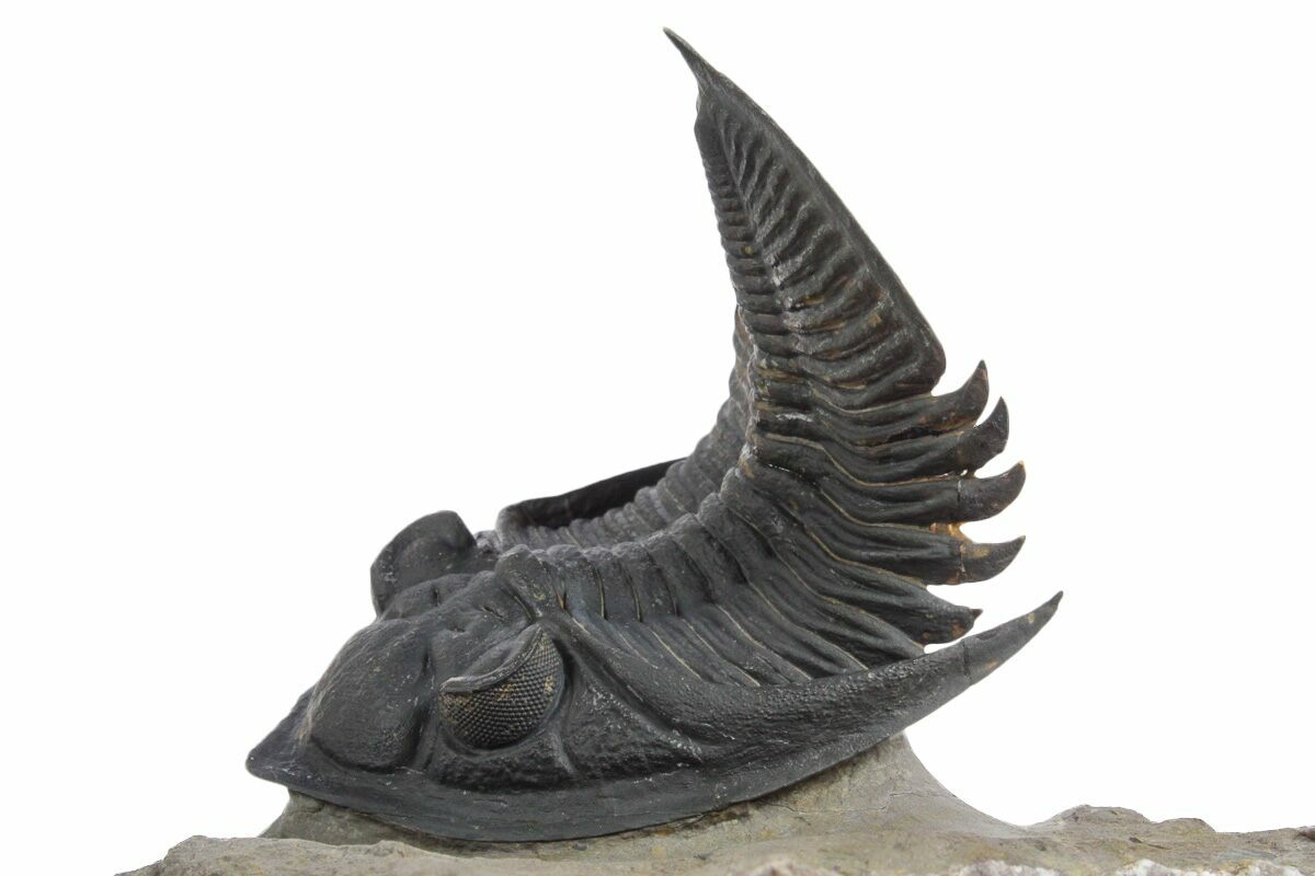 This is a stunningly prepared, 3.2" long (if outstretched) example of the Dalmanitid trilobite, Zlichovaspis rugosa quarried near Atchana, Morocco. This exquisite trilobite has had nearly all of the limestone removed from underneath its shell during preparation.