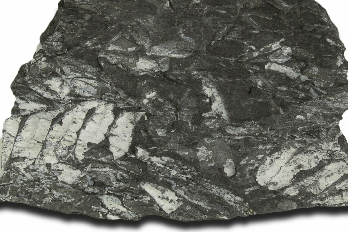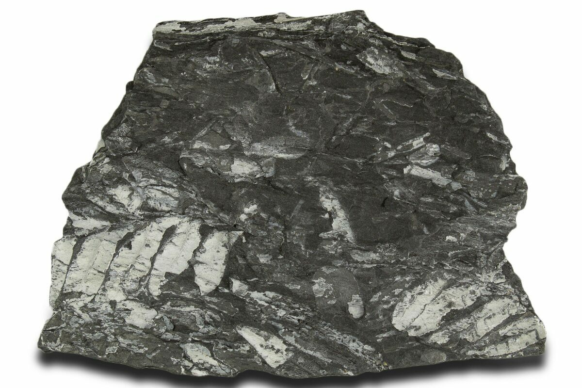 These plants were buried in a swamp where a low temperature, low pressure, and low oxygen environment caused the plant tissue to be slowly replaced by pyrite. This pyrite was later replaced by a whitish mineral (aluminum silicate) as the fossils were buried and exposed to the heat and pressure inside of the earth. The majority of the ferns on this plate are of the genus Alethopteris, though Pecopteris ferns can be seen from time to time.