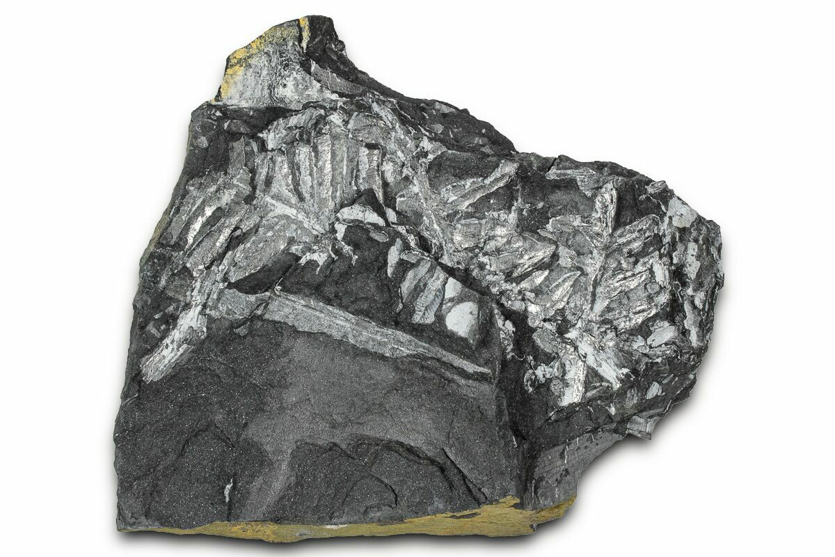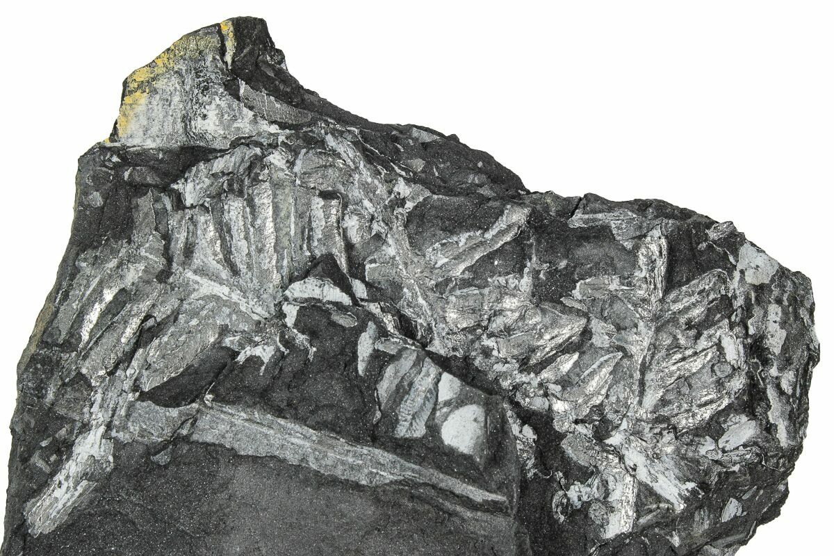 These plants were buried in a swamp where a low temperature, low pressure, and low oxygen environment caused the plant tissue to be slowly replaced by pyrite. This pyrite was later replaced by a whitish mineral (aluminum silicate) as the fossils were buried and exposed to the heat and pressure inside of the earth. The majority of the ferns on this plate are of the genus Alethopteris, though Pecopteris ferns can be seen from time to time.
