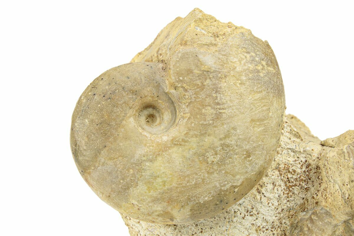 This is a 3.2" wide, natural association of ammonites (Parkinsonia sp. and Hectioceras sp.) collected from Dorset, England. They are Jurassic (Bajocian Stage) in age, or approximately 168 million years old. Both have been nicely exposed from the rock they were found in.