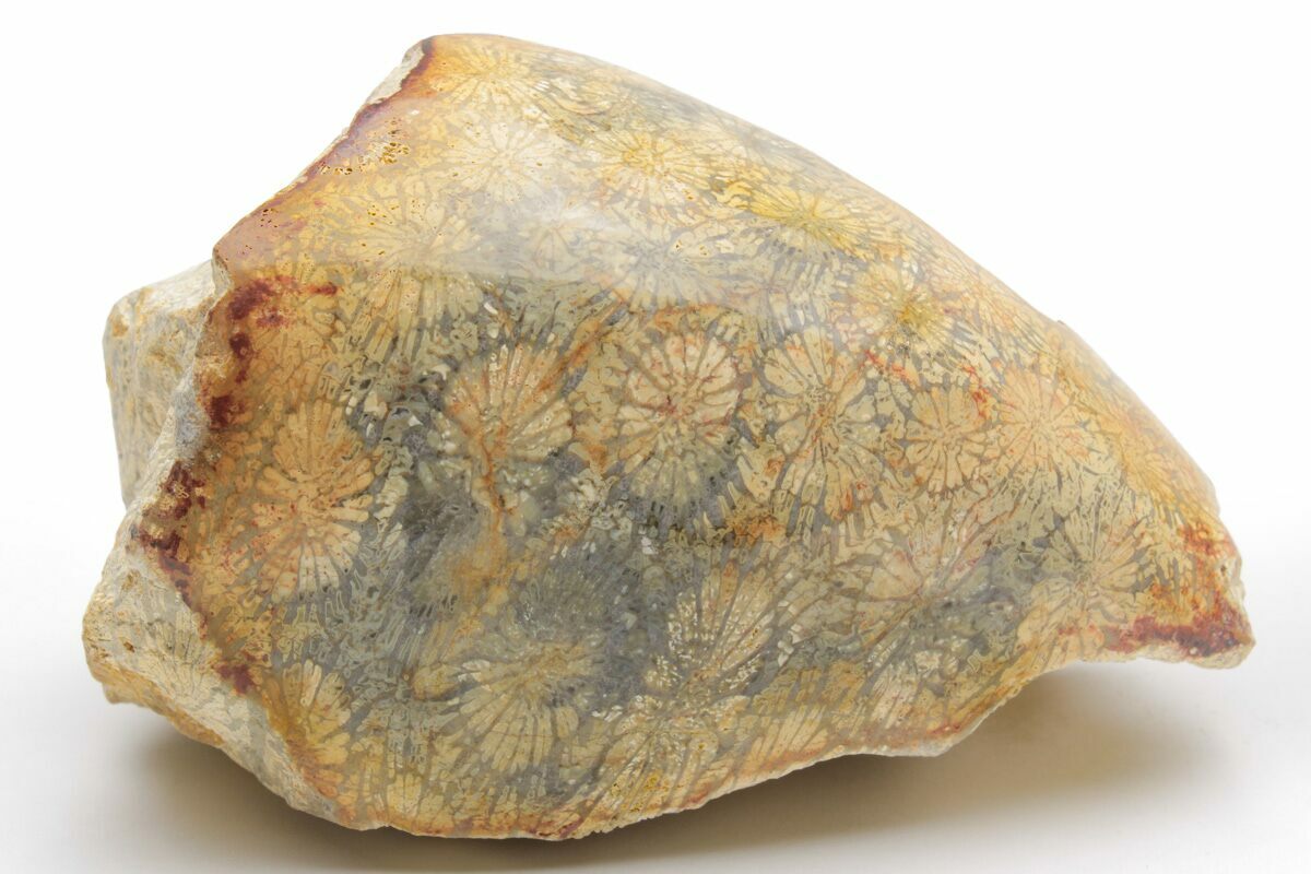 During this process, the original organic skeleton was replaced and infilled by a complex blend of silica, iron, manganese, calcium, and trace elements, often producing exquisite agatized preservation with rich banding, druzy crystal pockets, and occasional metallic dendrites formed by manganese or iron oxides. Unlike many fossils that compress or distort, coral fossils frequently preserve their original 3D colony structures—including delicate corallite cups, growth branches, and surface textures—making them an unusually faithful archive of reef morphology. Some specimens also record micro-borings left by sponges, worms, and bivalves, frozen mid-process before mineralization sealed them