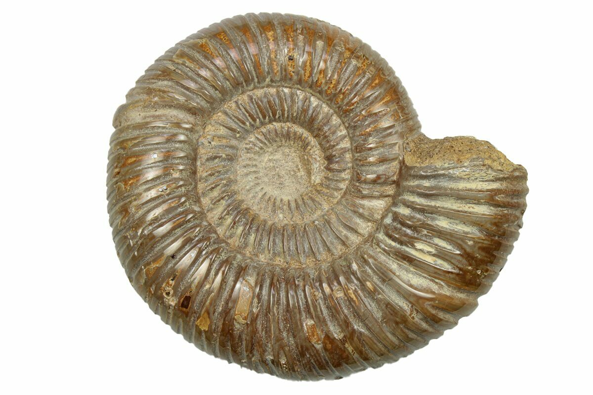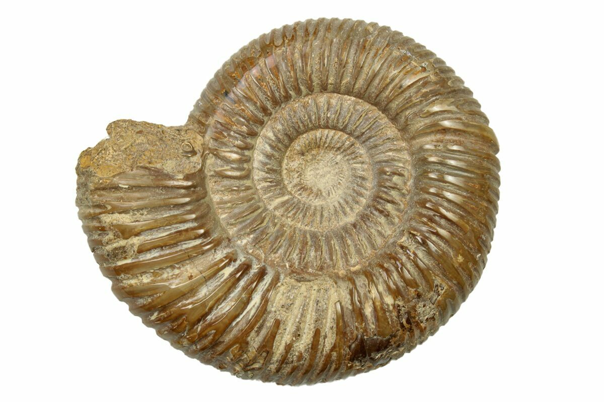This is a 3.2" wide ammonite (Perisphinctes sp.) fossil that was collected near Sakaraha in the Tulear Province of Madagascar. It is Jurassic (Oxfordian Stage) in age or approximately 160 million years old. It has well-defined ribbing and is quite heavy for its size. The exterior has been lightly polished.