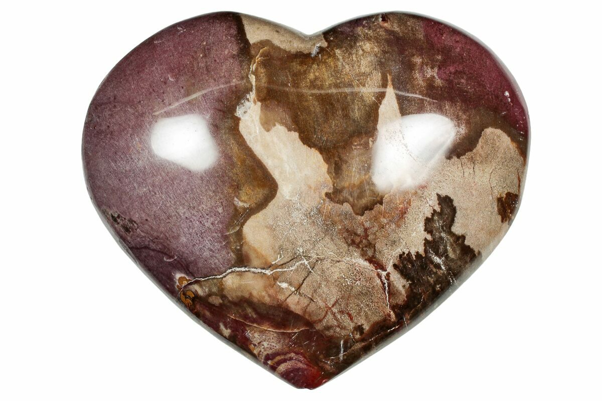This is a 3.2" wide colorful polished petrified wood heart. It is from the Araucaria tree, a type of conifer. This petrified wood is early Triassic in age, or approximately 220 million years old, close to the time the first dinosaurs appeared on the planet. The wood was collected near Ambilobe, Madagascar.