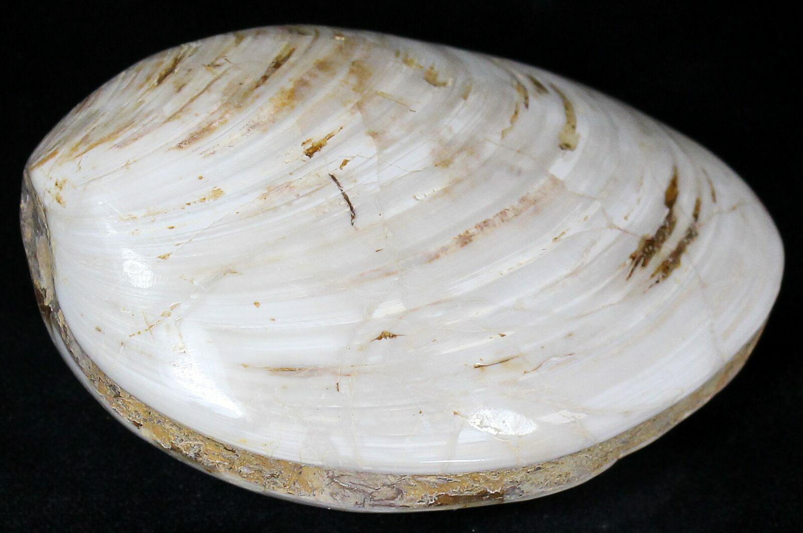This is a large, polished fossil clam collected near Sakaraha, Madagascar. It's Late Jurassic in age or approximately 150 million years old. It's around 3.2 inches across and has been polished.