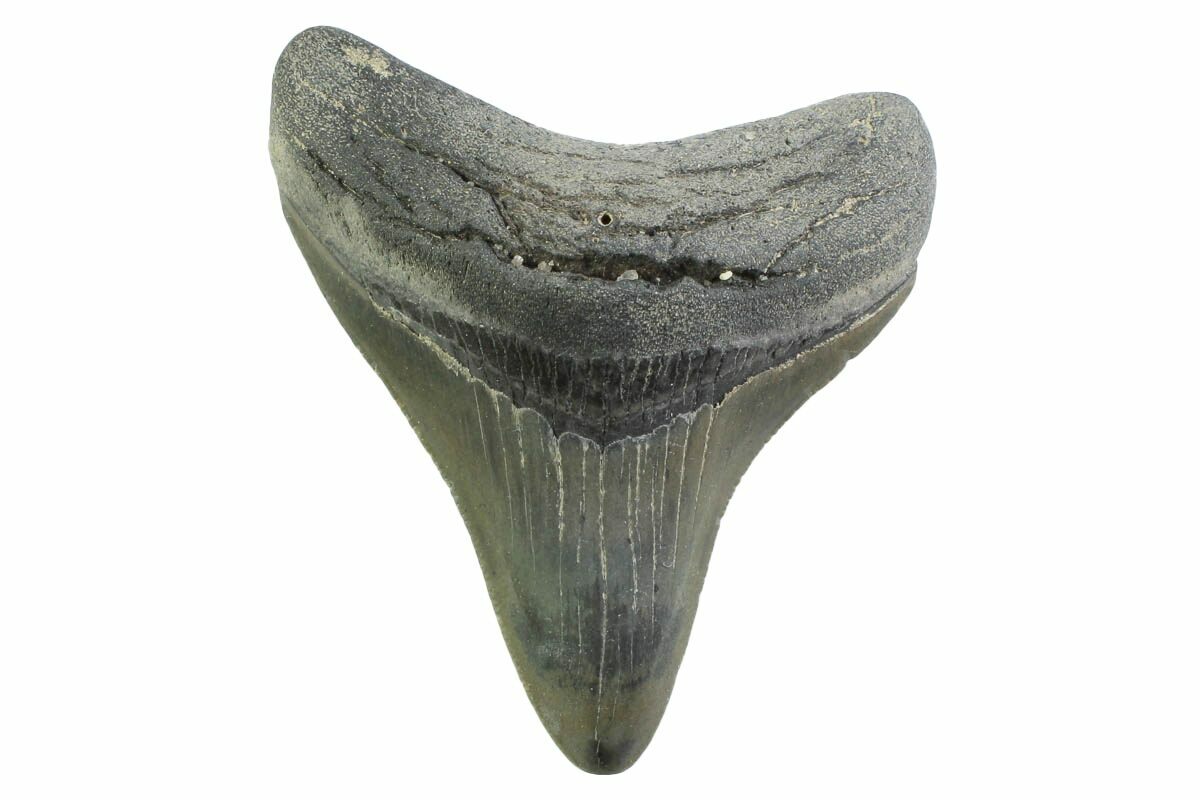 This is a 3.22" long fossil megalodon tooth collected from the Savannah River area along the border of Georgia and South Carolina. The tooth would have come from a prehistoric mega-shark in the 30 foot size range.