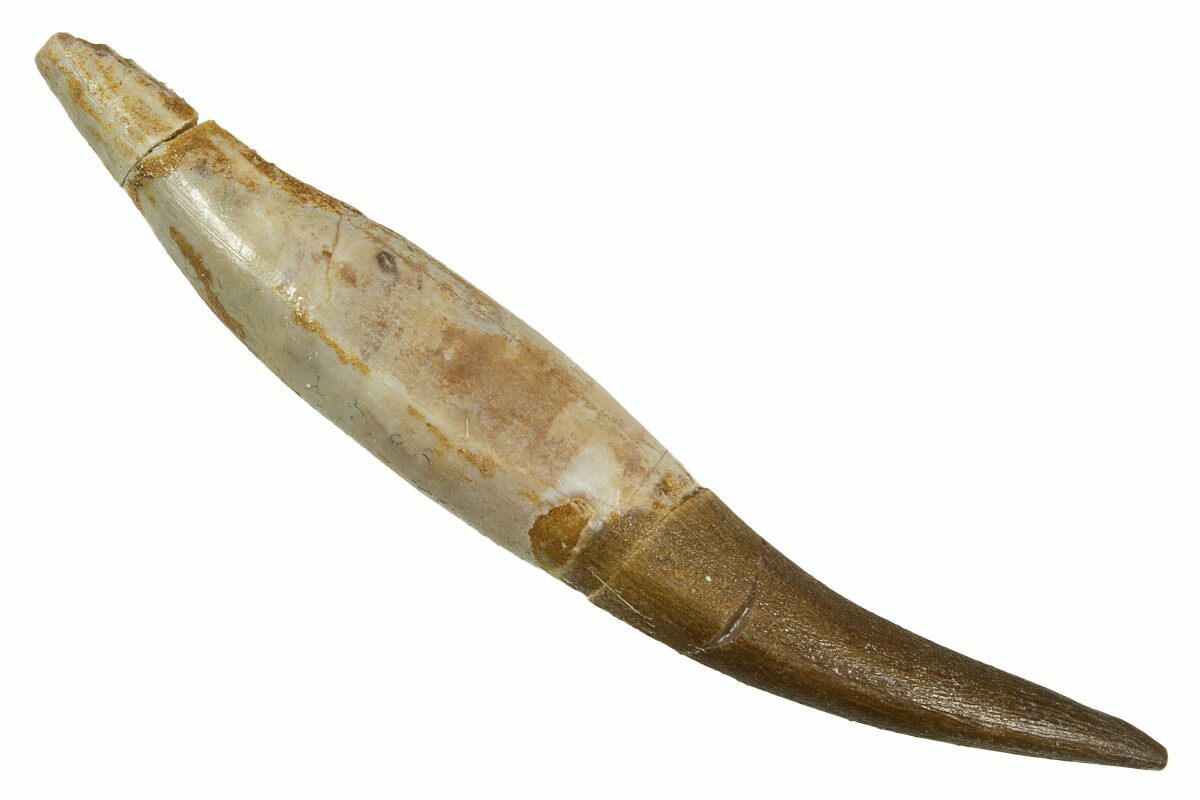 This is a 3.24" long, rooted tooth from the Cretaceous marine reptile Zarafasaura oceanis, a long-necked plesiosaur from the Oulad Abdoun Basin of Morocco. The tooth preserves nearly the entire root—a rare occurrence that indicates it was not a naturally shed tooth but one lost during the animal’s life. It has excellent enamel and an unworn tip. There are several repaired cracks along its length.
