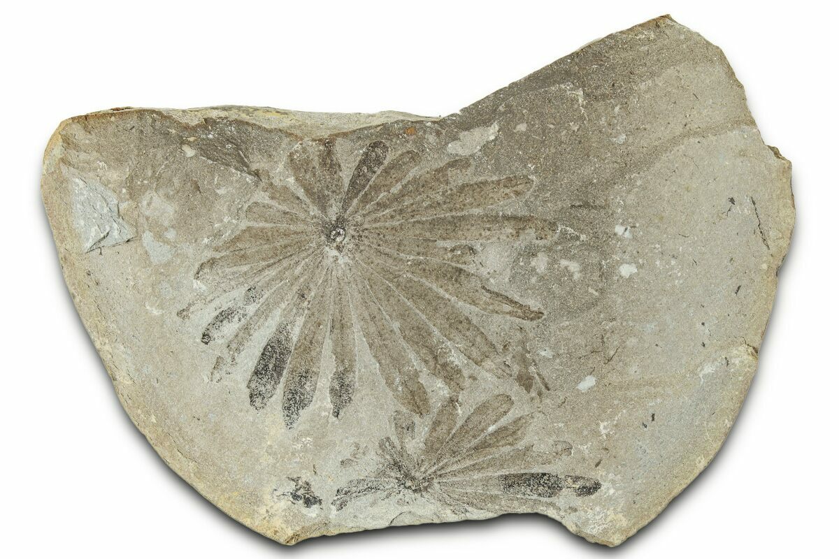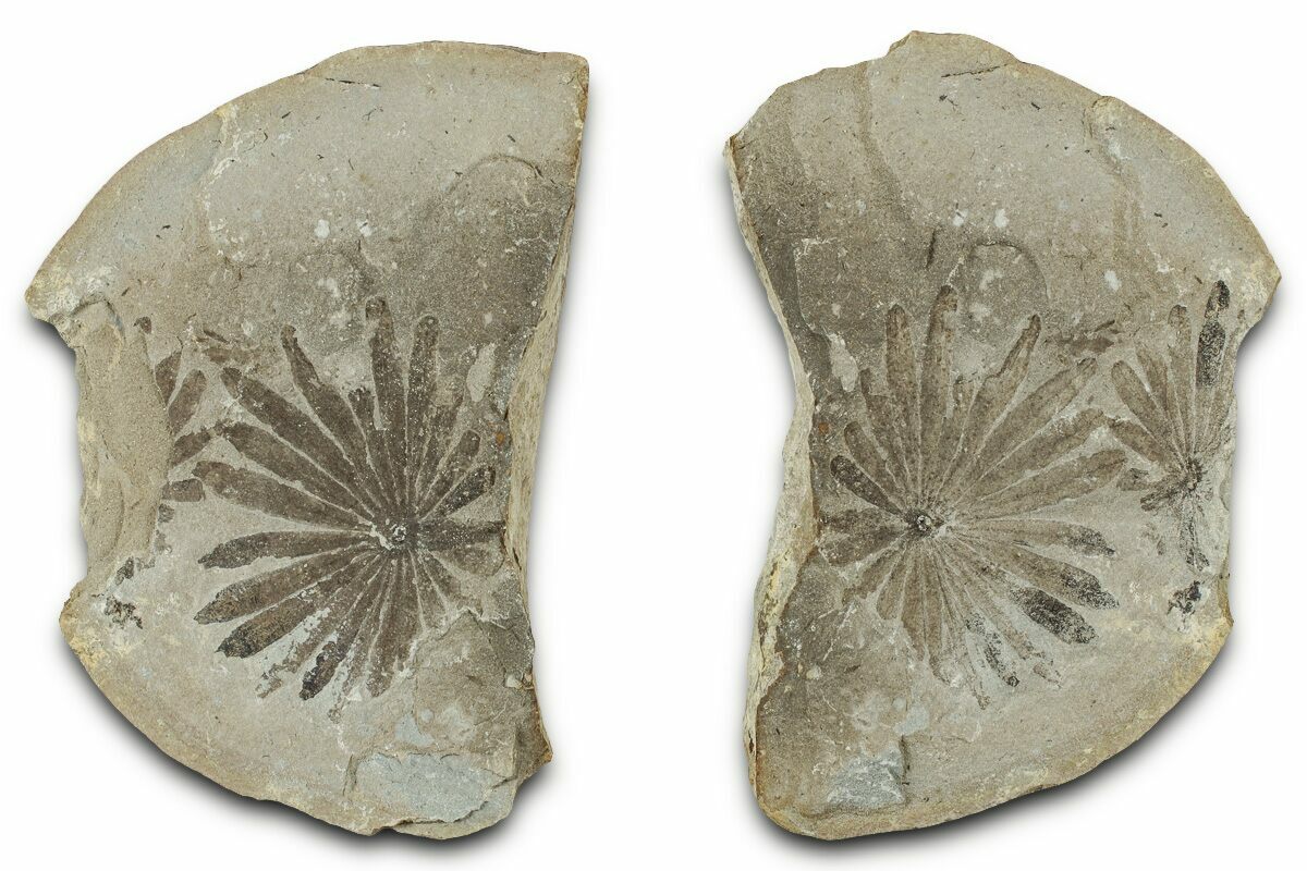This is a beautiful specimen of Annularia stellata from the famous Mazon Creek Lagerstatten of Illinois. It's preserved within a 3.25" wide ironstone nodule that has been split open. Both halves of the nodule are included and accompanied by acrylic display stands.
