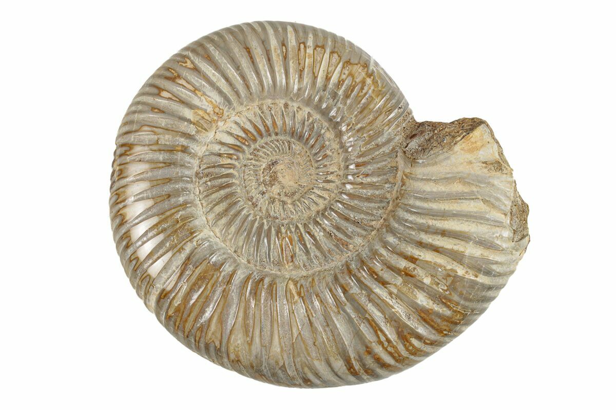 This is a 3.25" wide ammonite (Perisphinctes sp.) fossil that was collected near Sakaraha in the Tulear Province of Madagascar. It is Jurassic (Oxfordian Stage) in age or approximately 160 million years old. It has well-defined ribbing and is quite heavy for its size. The exterior has been lightly polished.