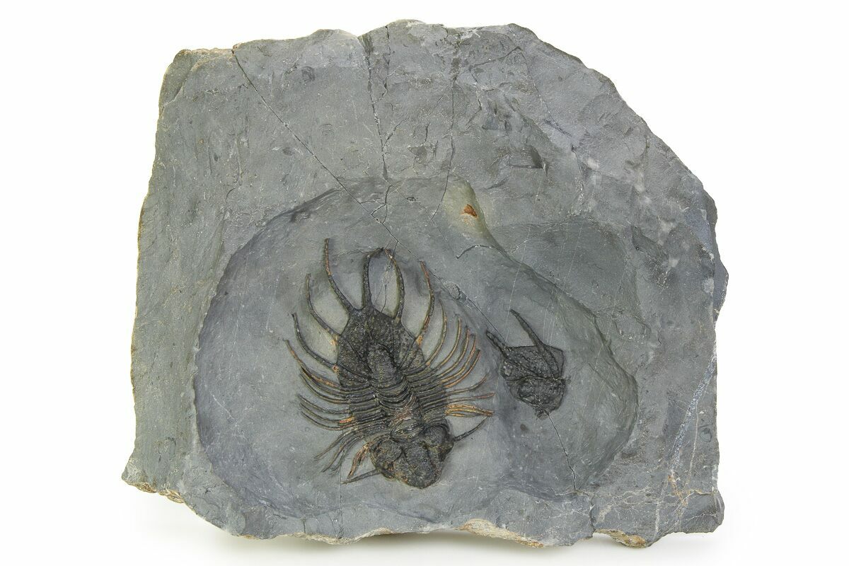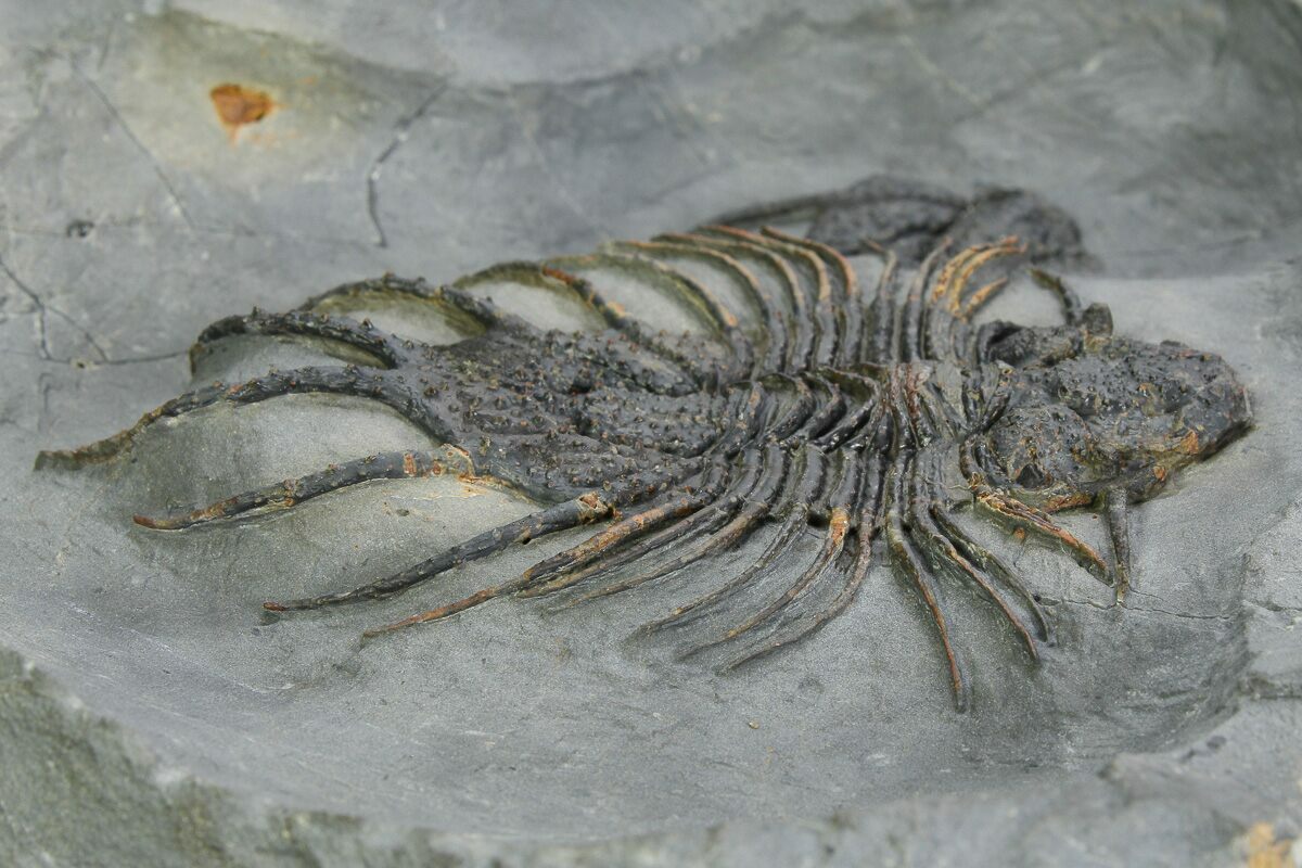 This is a very rare, 3.25" long lichid (Acanthopyge sp) trilobite from Issomour, Morocco. Real specimens very hard to acquire because not only are they very rare, but they tend to be found disarticulated and the original locality was collected out years ago. Unlike most which are molts, this oe has both cheeks tightly attached and has No Restoration. There is the tail of another specimen just to the left of its body.