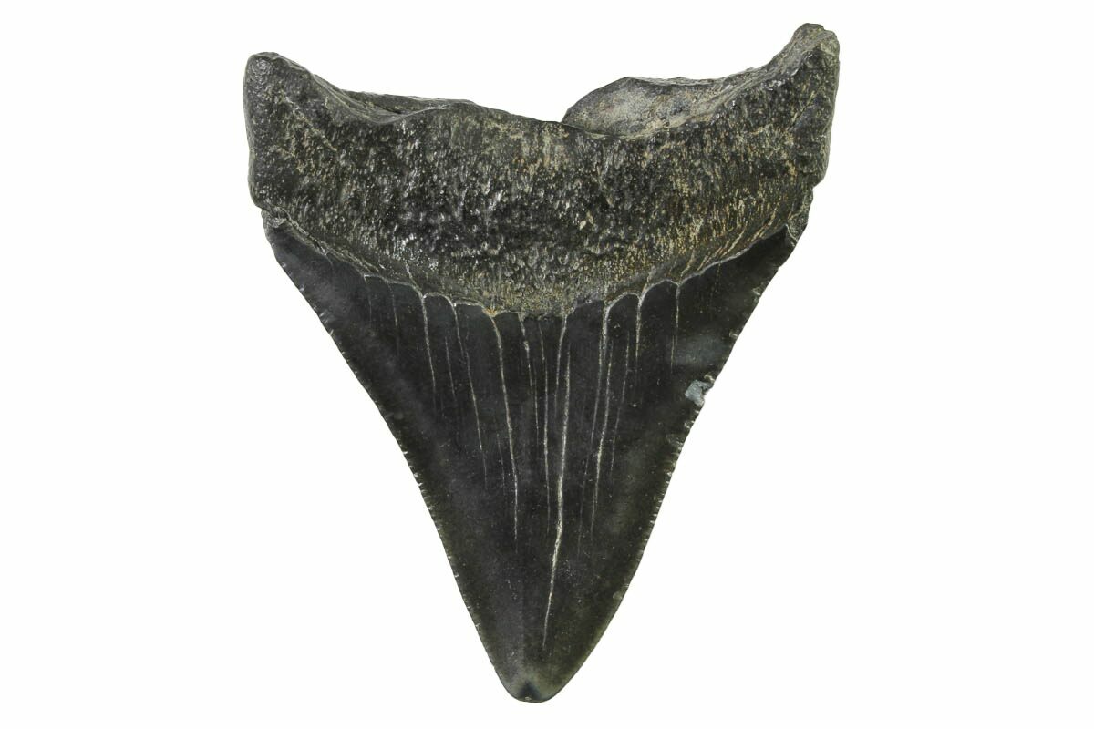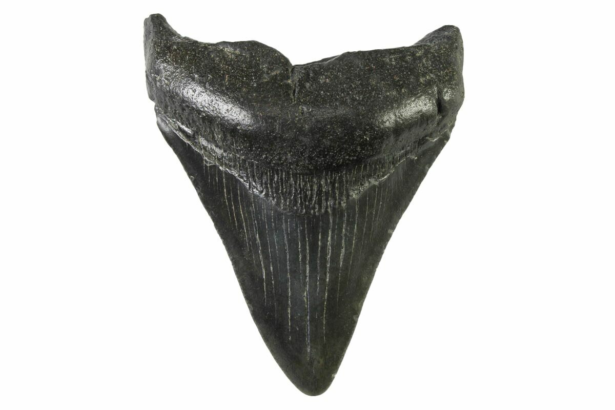 The standard measure for megalodon teeth is slant height, or the longest edge of the tooth. Adult megalodon teeth were typically in the 4 to 5 inch range: teeth over 6 inches are rare and represent super-sized individuals. Only a handful of teeth have ever been found over seven inches.