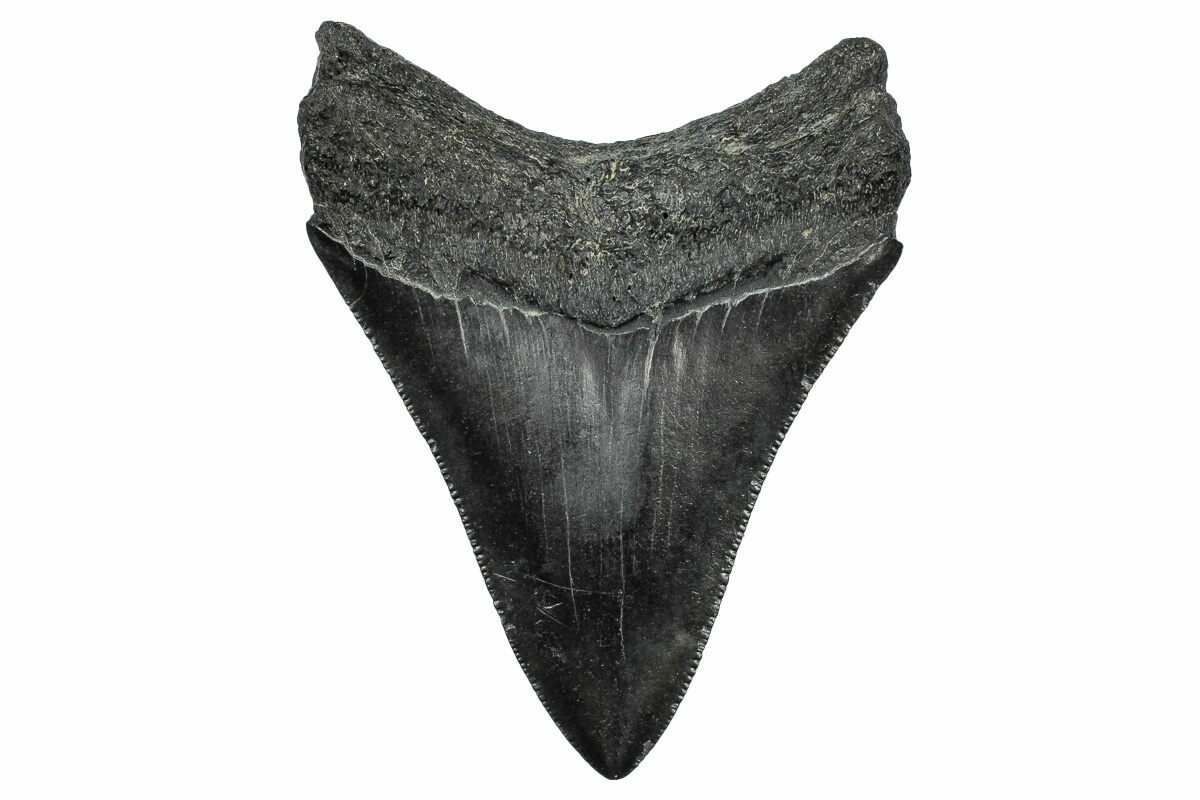 The standard measure for megalodon teeth is slant height, or the longest edge of the tooth. Adult megalodon teeth were typically in the 4 to 5 inch range: teeth over 6 inches are rare and represent super-sized individuals. Only a handful of teeth have ever been found over seven inches.
