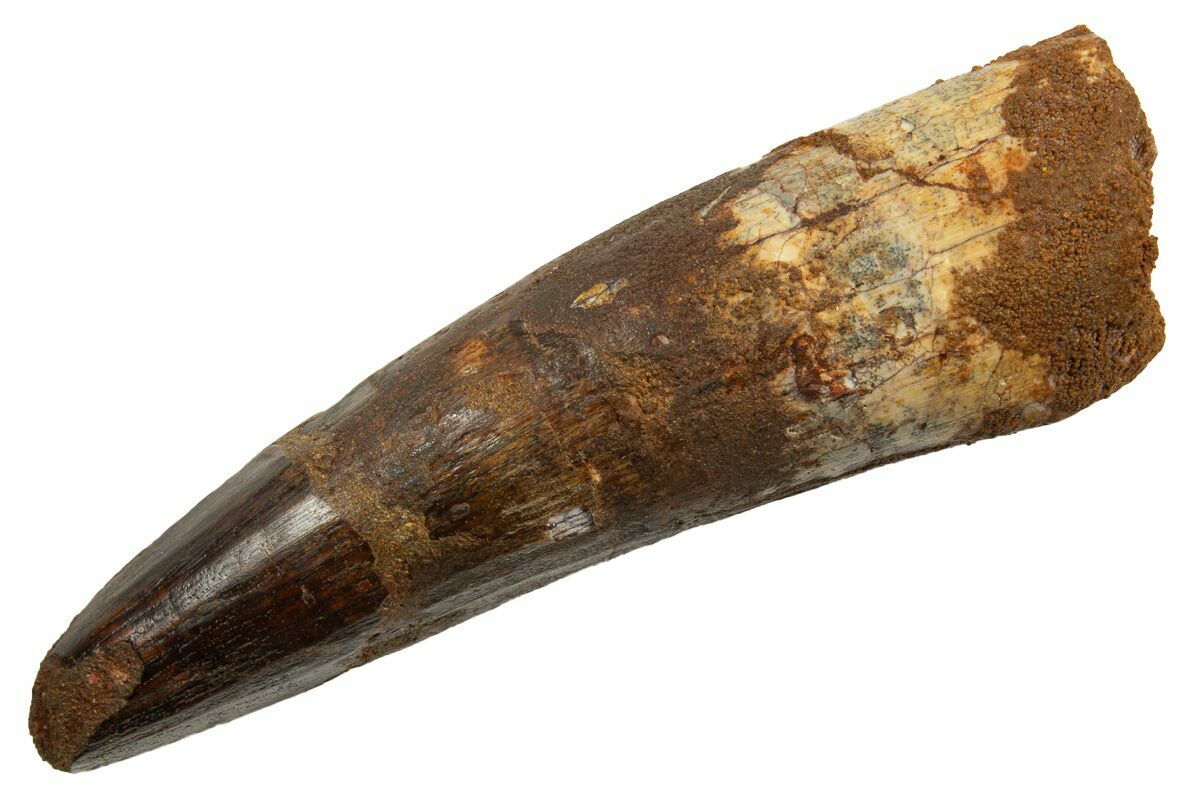 This is a 3.28" long Spinosaurus tooth from the Kem Kem Beds of Morocco. It is Late Cretaceous in age, approximately 95 million years old.