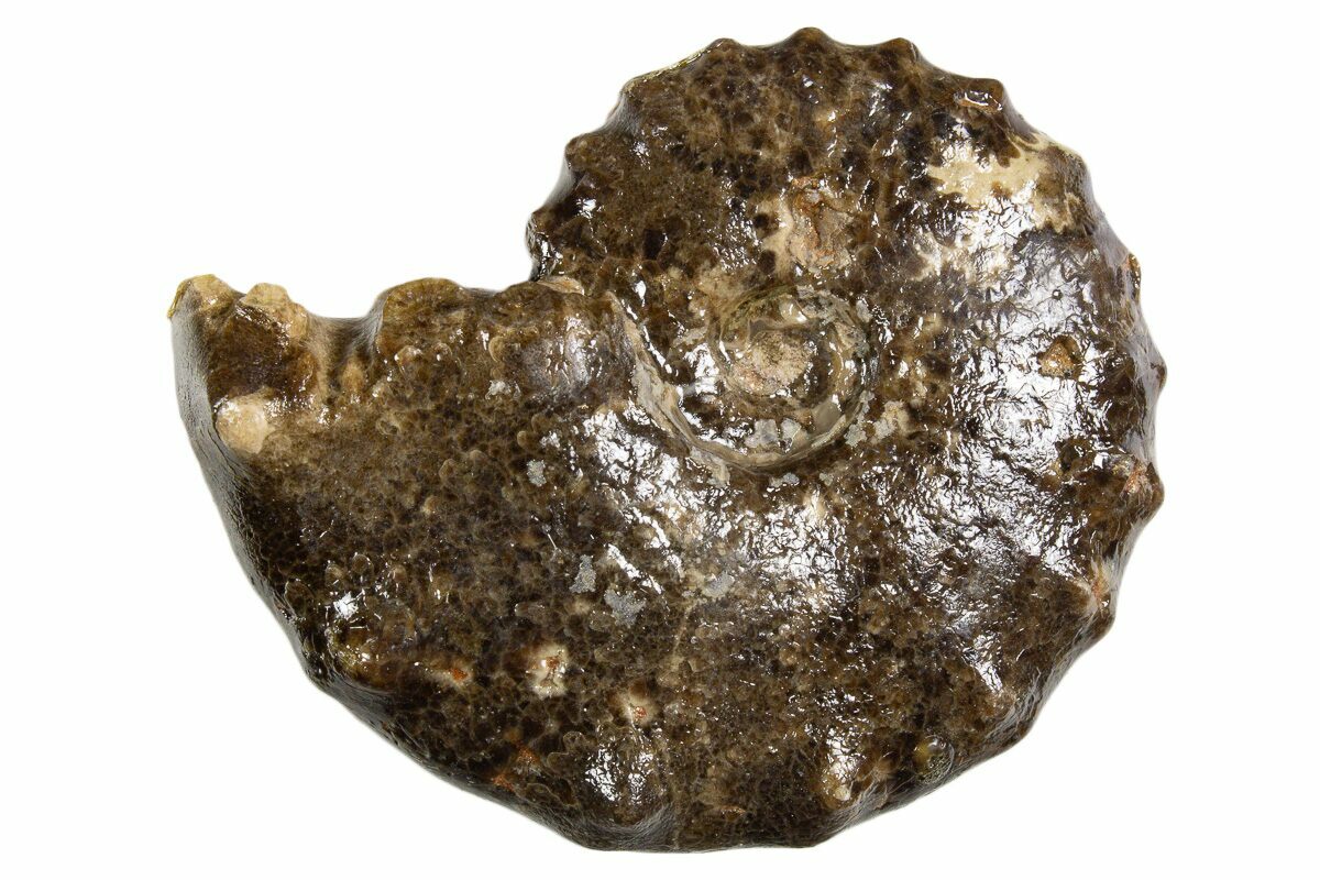 These ammonites are characterized by their moderately involute shells with thick, ribbed whorls and strong tubercles (knobby projections) along the ventrolateral margins. The ornamentation often gives Mammites a distinctive, rugged appearance compared to smoother genera. Sutures are complex and deeply lobed, typical of the family Acanthoceratidae, to which this genus belongs. The shell’s coiling is usually compact, with an oval to subquadrate whorl section and a somewhat flattened venter.